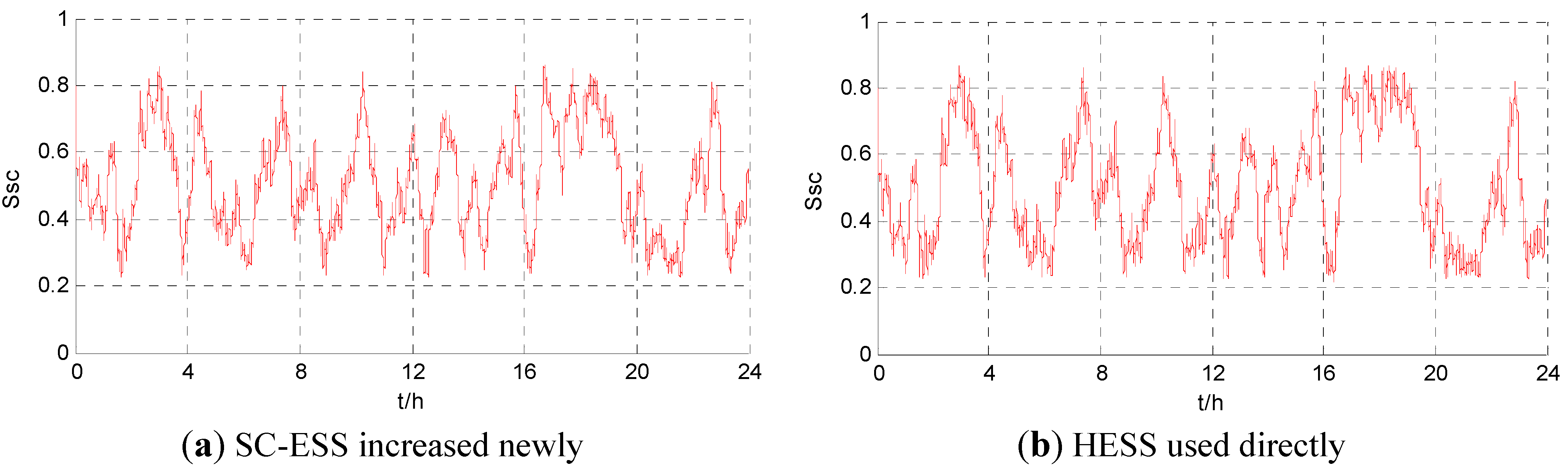 The main control parameters of HESS using the two strategies are Tf0 and ΔSco_SC. The value of ΔSco_SC is set as 0.35 the median of the margin indictor and remains unchanged, because it exists only in the coordinated control strategy. The changes of Tf0 may result in changes of HESS operation under both control strategies. It is necessary to exclude the impact of comparative analysis results of different control strategies by the filter time constant. So the HESS operation curves using different control strategies are given as Figure 6, Figure 7 and Figure 8 when Tf0 is 15, 30 and 45, respectively.