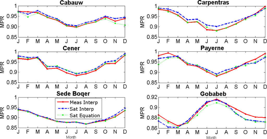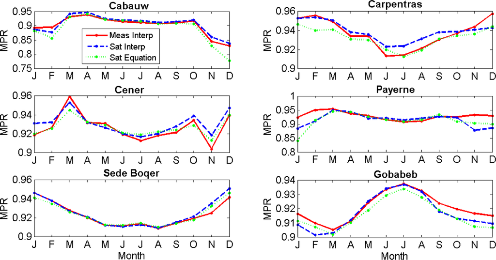 The monthly values of MPR are also very similar with some exception for Cabauw and Payerne where in the winter months the MPR value from applying directly Equation (4) to the satellite values results in lower values. This may be due to the fact that in the interpolation procedure, moments with low in-plane irradiance were discarded, while in the map-based calculation times with very low irradiance were retained.