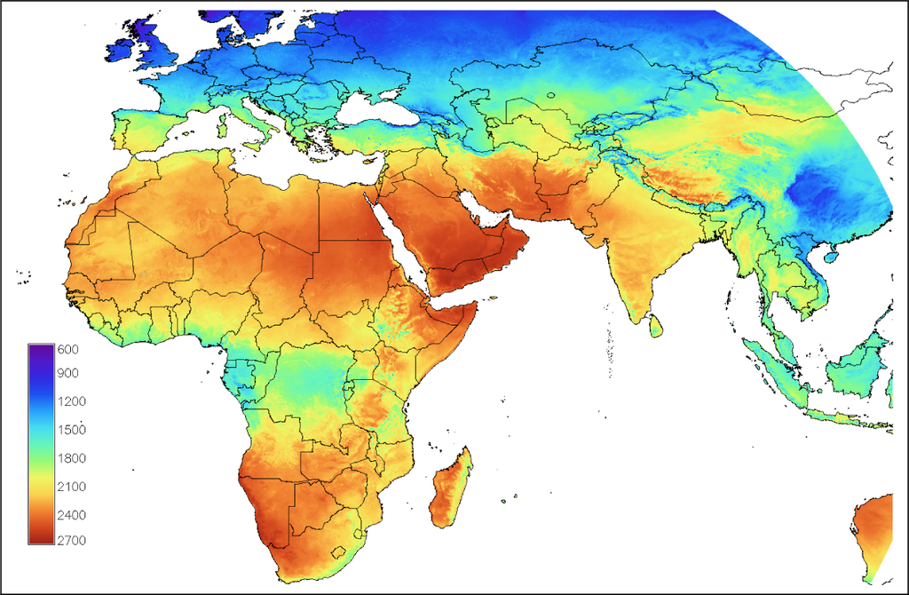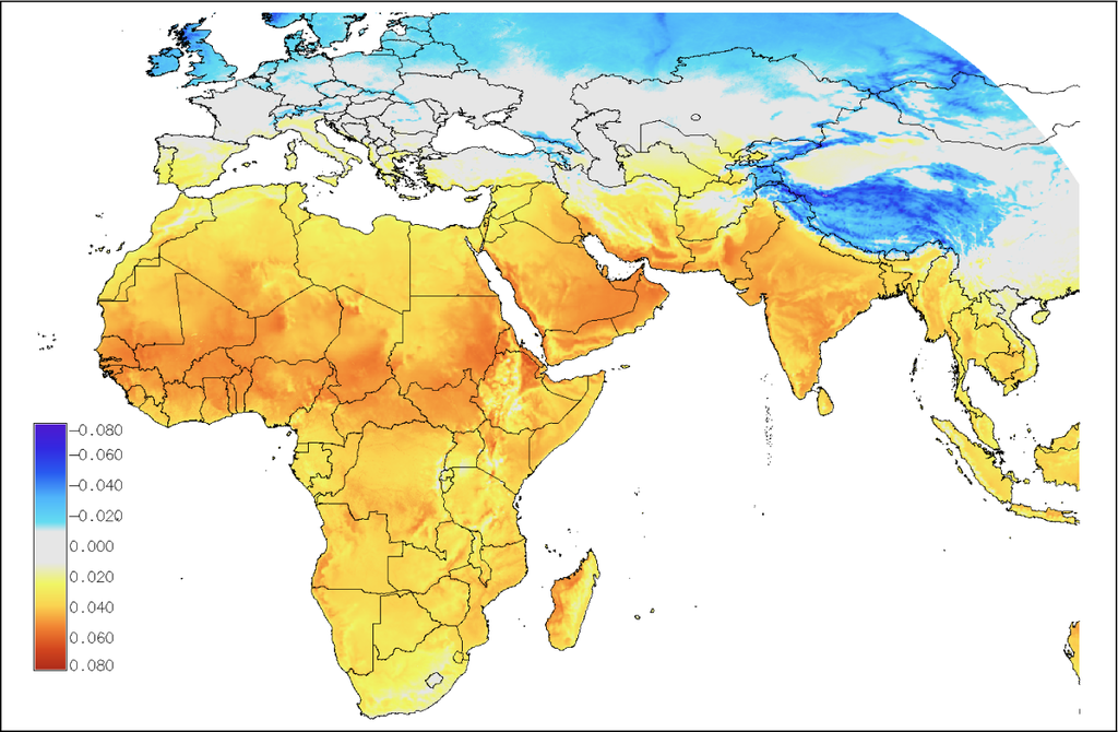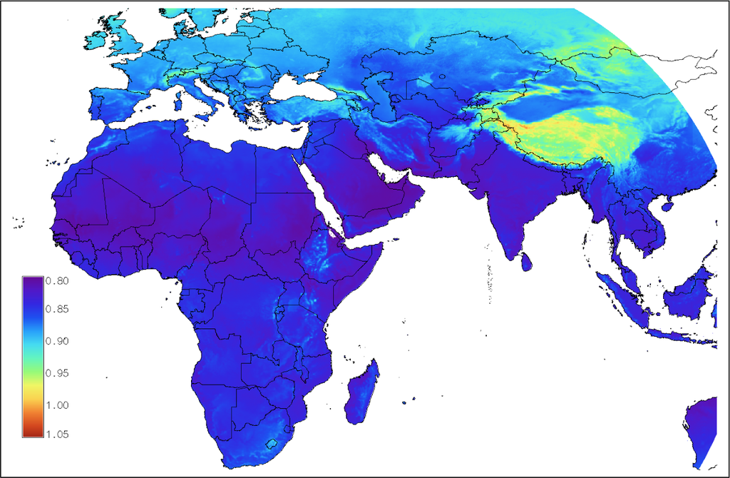 Using published models for these effects we have been able to calculate their magnitude over an area covering Europe, Africa and nearly all of Asia. Some of these effects are fairly homogeneous over the studied area while others vary much more strongly. Thus, the overall size of the angle-of-incidence effect is in the range −2% to −4%. The effect of variations in the spectrum shows a greater range in magnitude. For crystalline silicon modules this will range from −5% to +2% while the effect is more pronounced for CdTe modules, varying from −6% to +6%.