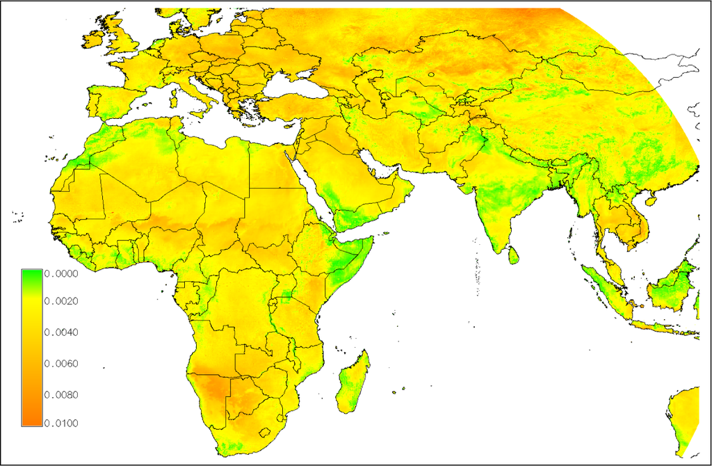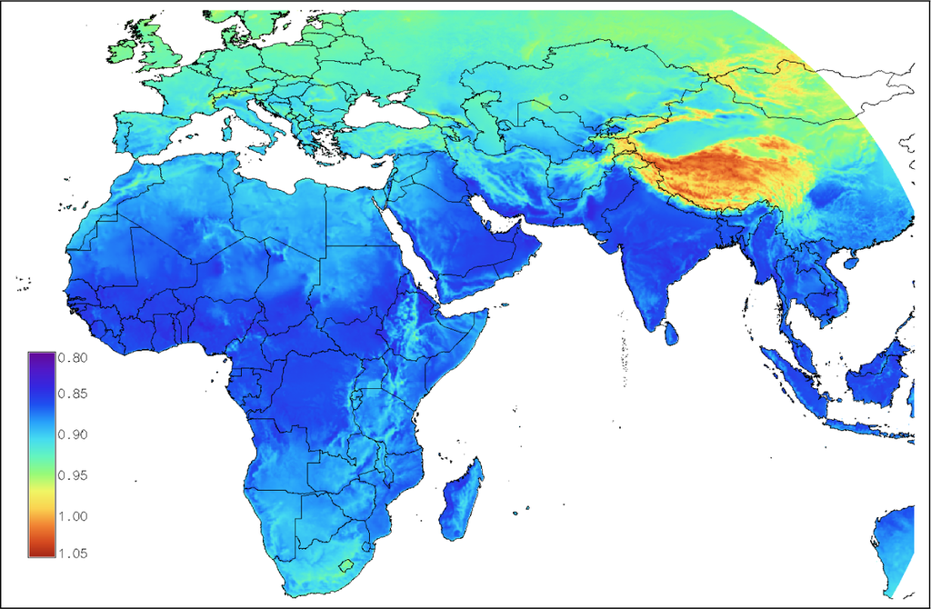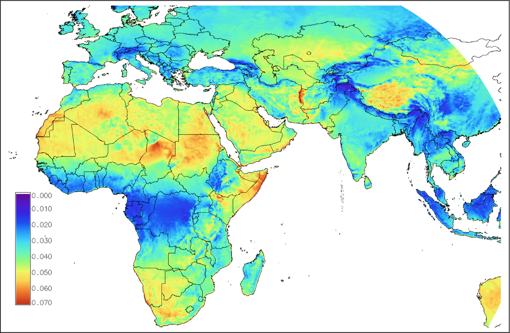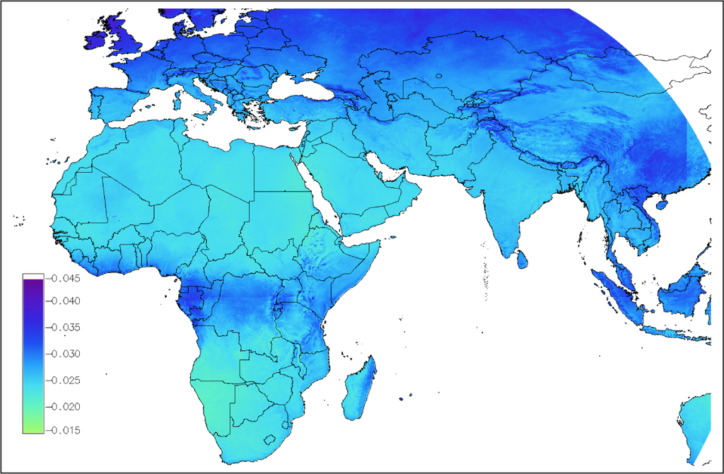 Using the data described in Section 2.1 with the methods from Section 3.7 the calculations were performed for land surfaces in the area with the bounds: