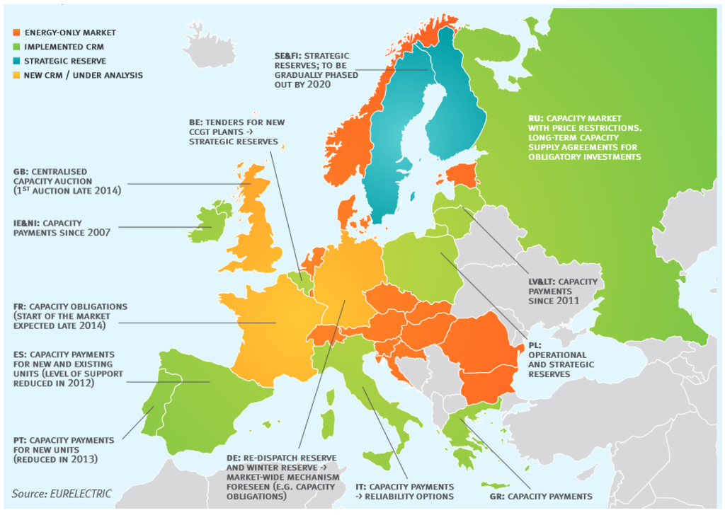 Implementation of capacity remuneration mechanisms (CRMs) across Europe as of June 2014 [10].