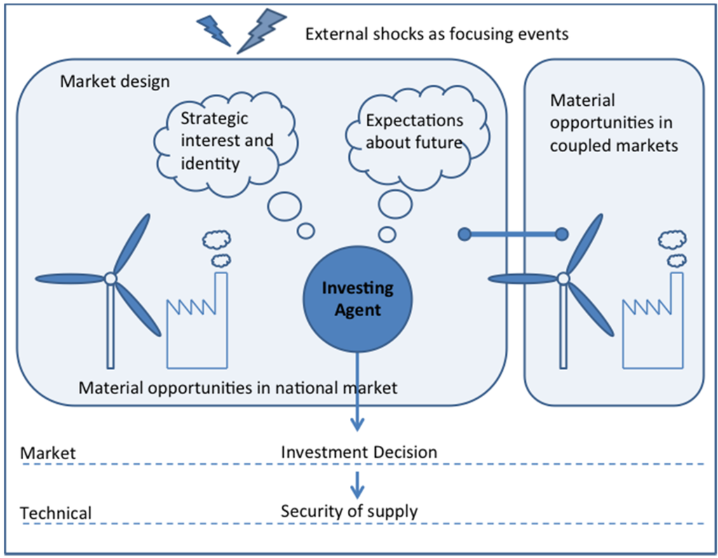 In the following, we apply preliminary conceptual remarks on the market as a social institution to the case of security of supply in European electricity markets [35]. We define the behaviour of market actors as the dependent variable. If investments in flexible capacities are high enough, the threat of insufficient security of supply in the future is diminished. Capacities for security of supply in the electricity sector are defined here as the total of all investments in flexible options that are available to the respective electricity market at a certain point in time. Flexible options can be flexible generation capacities such as gas fired power plants, storage opportunities as well as demand side flexibility. We identify five determinants that may have an impact on the investment activity of a market actor: The current market design, the material opportunities in the national system and in coupled systems, the market participant’s expectations about future developments, the strategic interest and identity of a market participant and focusing events that may pose a shock to the market, such as the Fukushima disaster. These variables are shown in Figure 2. We identified these five variables by literature review, by working together with practitioners in previous projects such as BETTER (http://www.better-project.net/), CLIM-RUN (http://www.climrun.eu/) and within RGI (http://www.renewables-grid.eu/) and by applying the theoretical concept of sociological institutionalism to the case of the electricity market. The market design variable is the most accepted one, which is discussed in most scientific and political analyses [1,3,4,5,6]. The material opportunities variable was identified by the work with practitioners within the above mentioned projects, as practitioners generally do not focus on theoretical cases, but on real existing ones and take real world settings into account. The market participant’s expectations about future developments and the actor’s strategic interest and identity variables are derived from the theoretical concept of sociological institutionalism that understands any type of actor as embedded into a social order where non-formalized factors can be equally important as formal ones. The focusing events factor is taken from the study of empirical cases in political science and according to the literature [36,37,38,39,40].