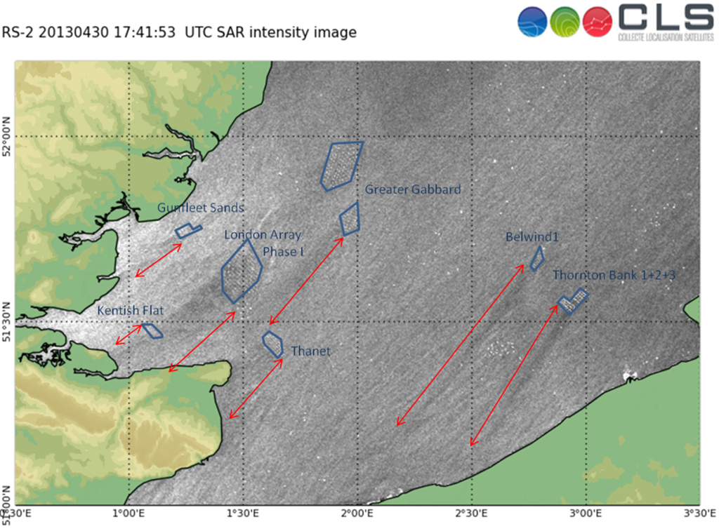 RADARSAT-2 intensity map of the southern North Sea observed 30 April 2013 at 17:41 UTC. The blue lines outline wind farms and the red arrows the wind farm wake.