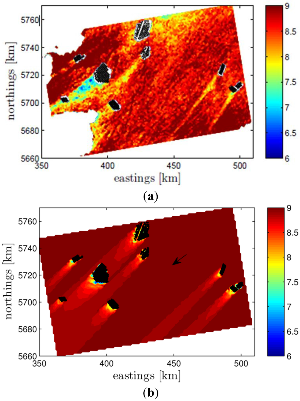 SAR data from RADARSAT-2 and Envisat ASAR WSM are used. From RADARSAT-2 only one scene is investigated. It is ScanSAR Wide in VV polarization. The wind field retrieval requires input information about the wind direction. From the RADARSAT-2 image the wake direction has been estimated as 40° and using this input for wind direction, wind speed has been retrieved using CMOD-IFR2 []. It is the equivalent neutral wind (ENW) at the height 10 m. The calculated wind speed is presented in Figure 2a. The original ScanSAR Wide product has spatial resolution 100 m. The spatial resolution is reduced to approx. 1 km in connection with the processing of wind fields. This is performed to eliminate effects of random noise and long-period waves.