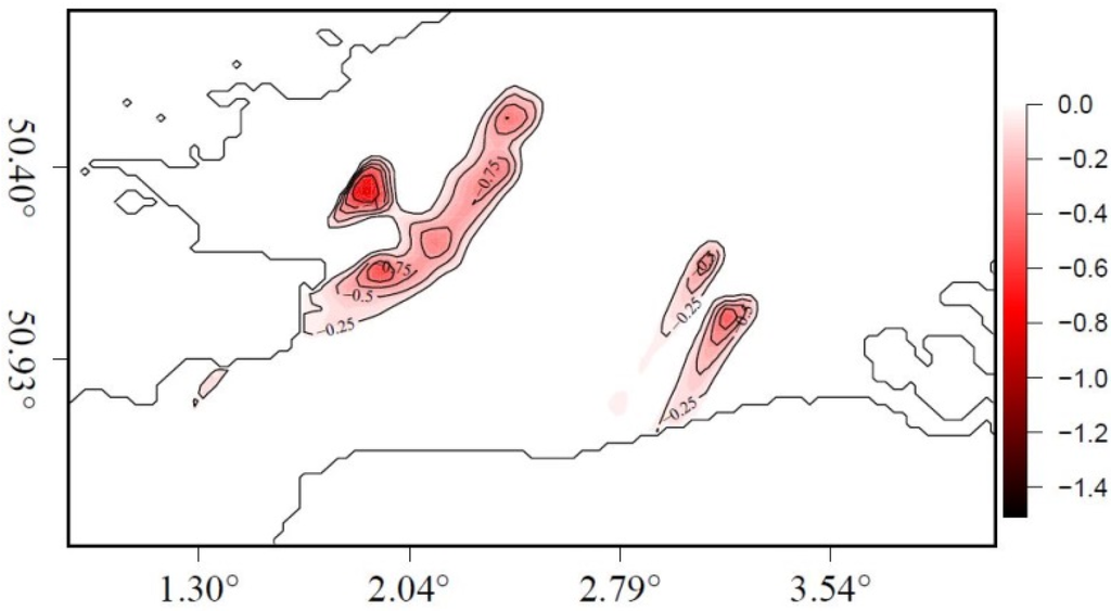 WRF wake model results on velocity deficit in m·s−1 at 10 m AMSL at 30 April 2013 at 18:00 UTC at the wind farms London Array, Greater Gabbard, Thanet, Belwind 1 and Thornton Bank.