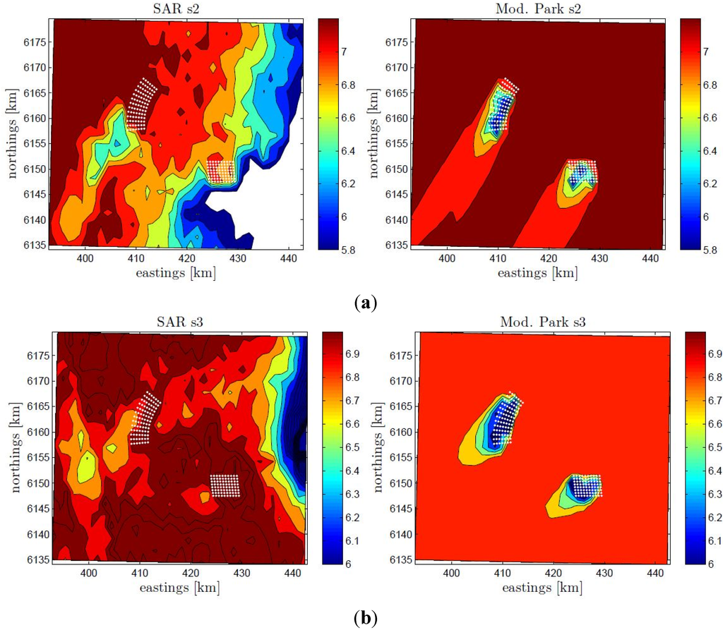 Average wind speed based on satellite SAR (left) and modified PARK wake model results (right) at 10 m height for the Horns Rev wind farm area for winds from Sector 2 (a) and Sector 3 (b). The color bar indicates wind speed in m·s−1.