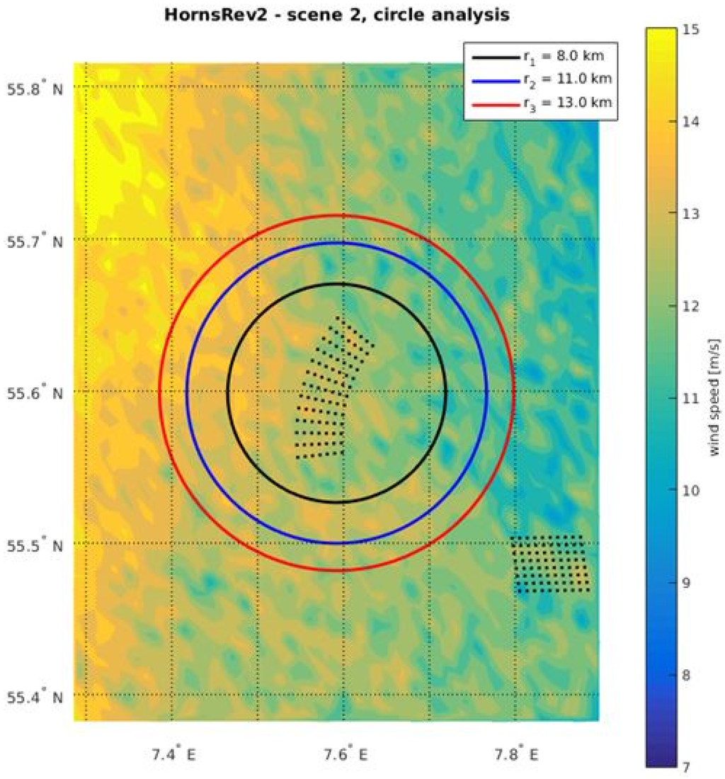 Figure 6 gives an example of the circles centered on the Horns Rev 2 wind farm. The wind fieldsare based on SAR data (1 km). It can be difficult to determine a wake by eye. For each SAR scene the wind speeds along these 3 circles are extracted and stored as Ui (θj), where Ui is the wind speed for circle i where i = 1, 2, 3 and θj is the compass direction relative to the center of the wind farm. θj steps through values from 0 to 359° with a 1 degree increment. The number of scenes used for the analysis depends on the wind farm under examination. The number is given in Table 4. The WRF model is run for all SAR scenes from Horns Rev 1 and 2, and results are extracted in a similar way from the WRF simulation results as for the SAR wind fields. The SAR results are valid at 10 m AMSL while WRF model results are available at 14 m AMSL.