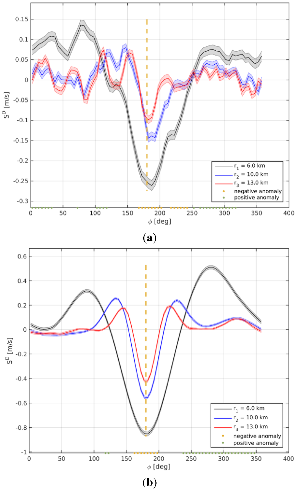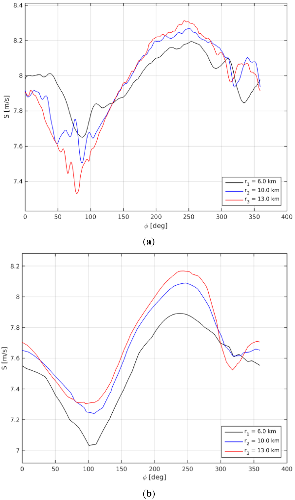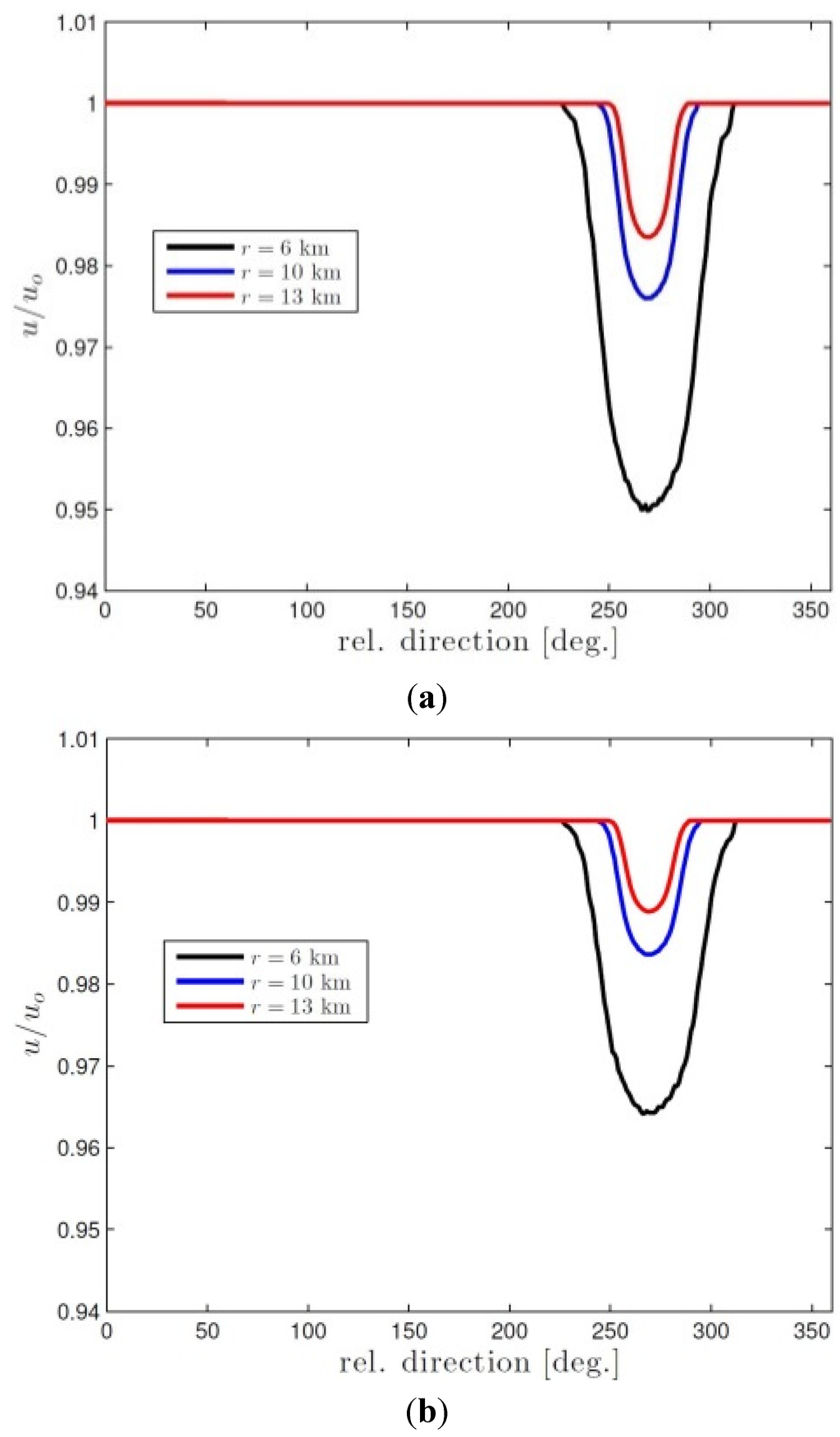 where k is the scene number, and Nscene is the total number of scenes. Figure 7a shows SN plotted against θ, for the Horns Rev 1 wind farm. We see from this plot how the mean wind speed depends on θ. This can be explained in terms of the gradient of the mean wind in the vicinity of the coastline. We call this the coastal gradient. Similar results of SN based on WRF are shown in Figure 7b. The coastal gradient in wind speed at Horns Rev 1 shows lowest values around 80°–110° (east), where the inscribed circles are closest to the coastline, and highest around 250° (west), where the inscribed circles are furthest from the coastline both in SAR and WRF. SAR shows a direction closer to 80° while WRF shows a direction closer to 110°. It is expected that there is an east-west gradient at Horns Rev as reported in []. For the eastern sector SAR shows higher wind speed values at the inner radius (6 km) and progressively lower values at outer radii (10 and 13 km) (nearer to the coastline). For the western sector SAR shows slightly higher wind speed at outer radii (further from the coastline).