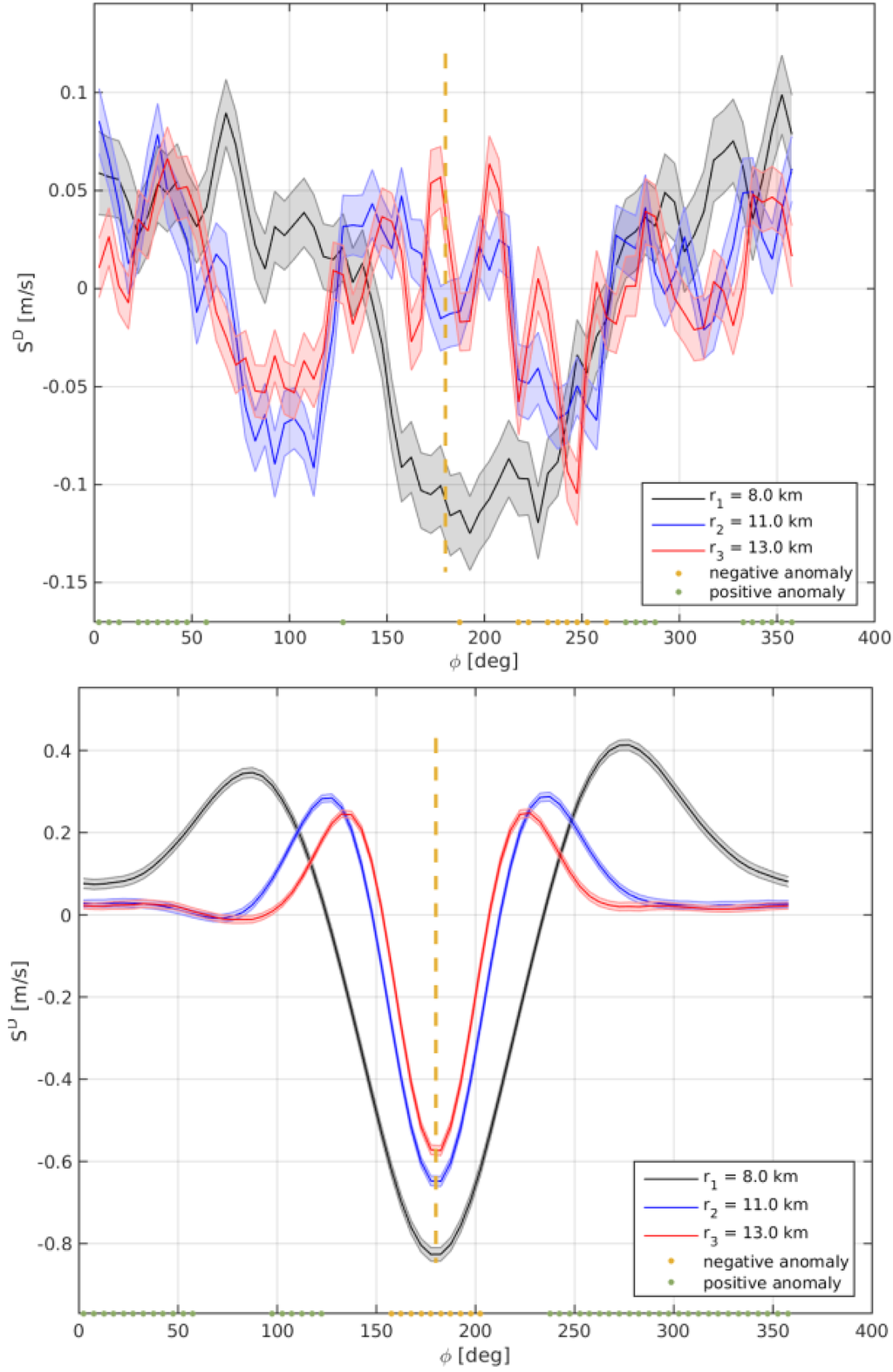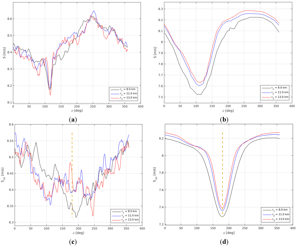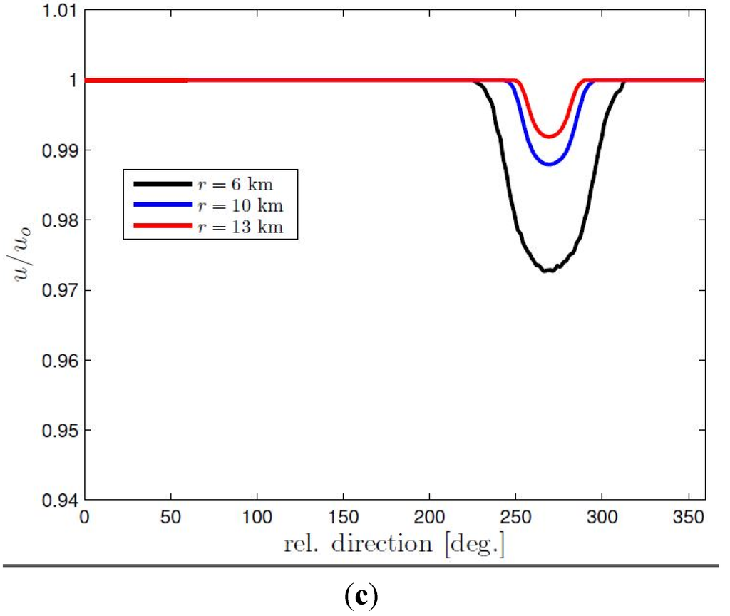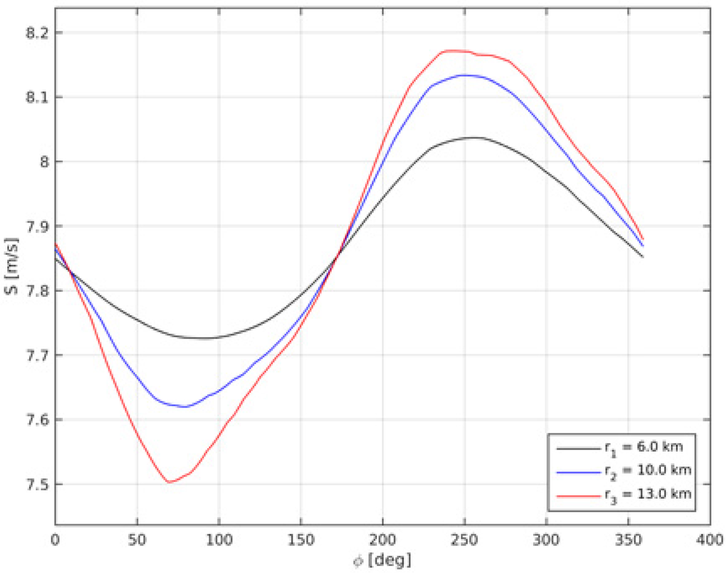To further reveal the wind farm wake from the heterogeneous wind field around the wind farm a method to calculate a wake wind speed deficit is employed. It is based on calculating a local perturbation of the wind speed on each SAR scene based on the side lobe wind speeds. The side lobe wind speeds are used at the directions φ + Δφi and φ − Δφi. For the smallest radius Δφ1 = 90°, this means that the side lobe wind speed is from the left and right of the wind farm, at a distance of r1 from the farm center. For the other radii, the side lobes have the same distance, r1, from the line aligned with the wind direction and passing through the center of the wind farm, thus: