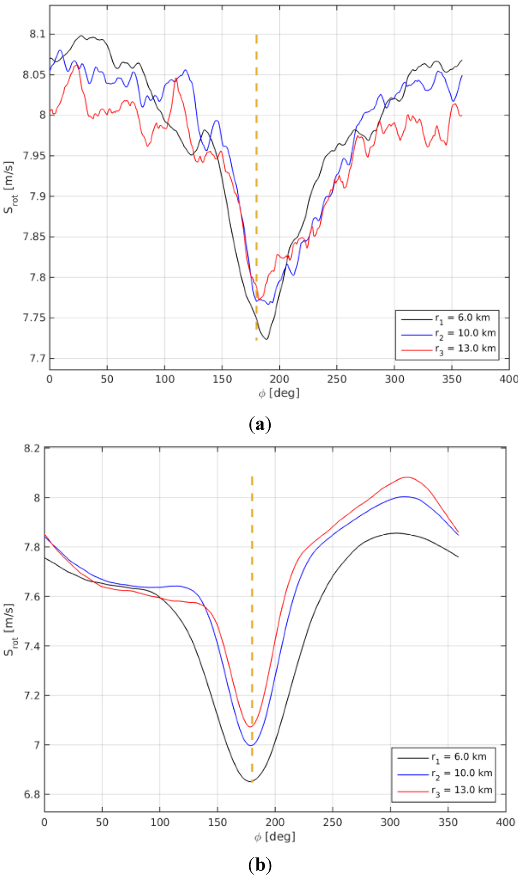 Figure 9a shows SR plotted against φ, for the Horns Rev 1 wind farm. The corresponding results of SR based on WRF simulations are shown in Figure 9b. Please note that the differences between the top and bottom panels are due to the individual rotation of each scene prior to averaging and not the result of a single rotation by one angle. The similarity in form between SAR and WRF for the rotated maps (Srot) is very good with low wind speeds showing at all radii at around φ = 180°. The inner radius shows more wake effect than outer radii. The SAR derived results are less smooth than those from WRF because the SAR scenes capture variability at smaller scales, due to the heterogeneity of the wind field, than is modelled by WRF.