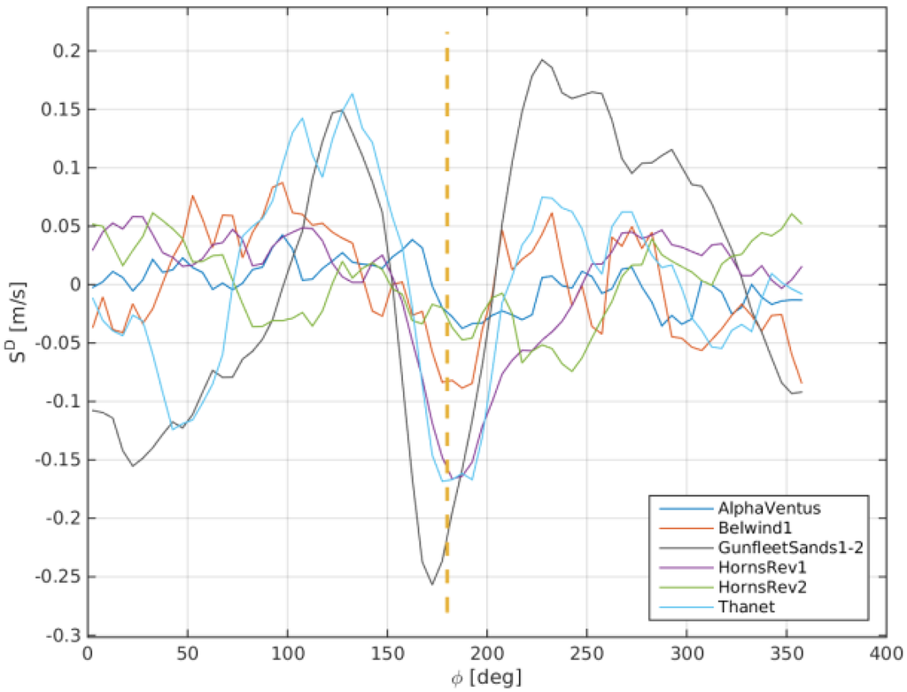 Finally, at the Alpha ventus wind farm, the smallest wind farm in terms of installed capacity and area, there is observed wake wind speed deficit at around 180°. The wind farm wake is not as pronounced as for the larger wind farms investigated. This is expected due to the size of the wind farm. The coastal gradient is not observed in the result but is noted in the coastal wind speed gradient (S) (not shown).