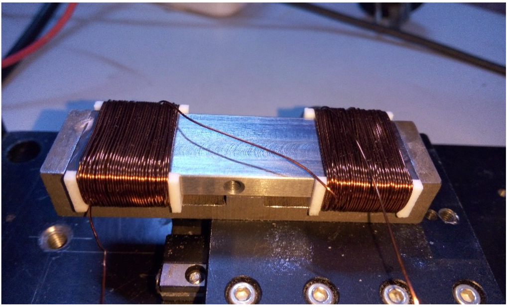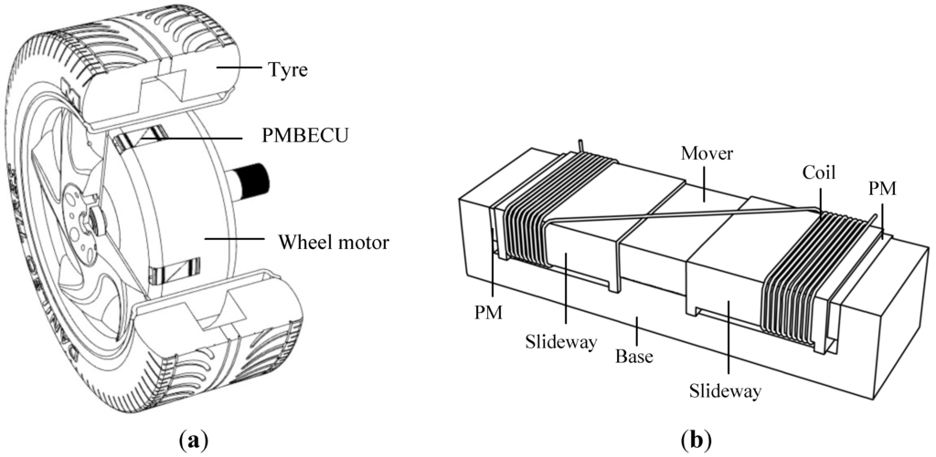 The assembly of the PMBECUs to realize the flexible connection between hub and motor is shown in Figure 1a, and the structure of the PMBECU, in which two PMs with opposite polarities are mounted on each side of a rigid E-type ferromagnetic base, is shown in Figure 1b. The ferromagnetic mover is placed in two low-frictional slideways which are non-magnetic. Two coils are connected n series and wound around each slideway.