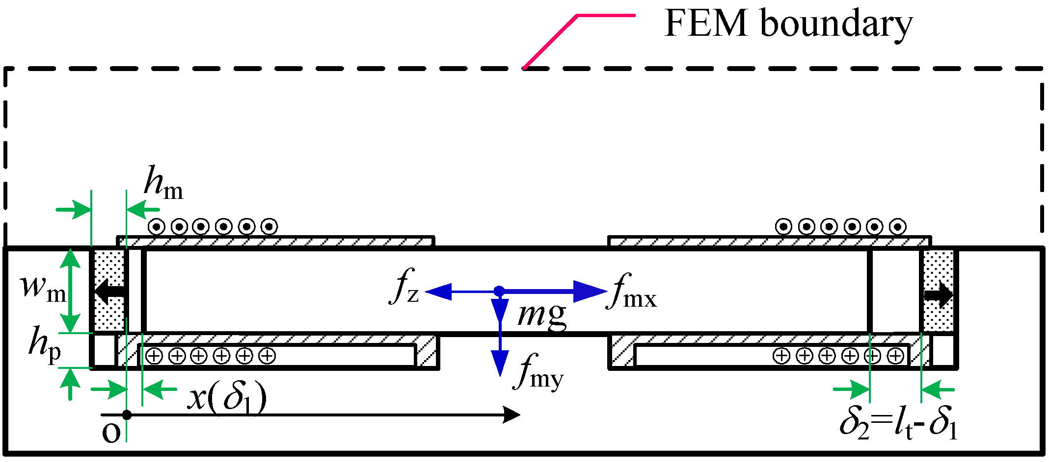 where Bn, Bs are the outer normal and tangential components of the flux density on the mover, respectively. Out of an infinite permeable surface, the flux density only has a normal component. Hence, combined with Equation (3), the holding force (horizontal) at steady state (δ1 = 0, δ2 = lt, lt is the travel length of the mover) can be approximately calculated by: