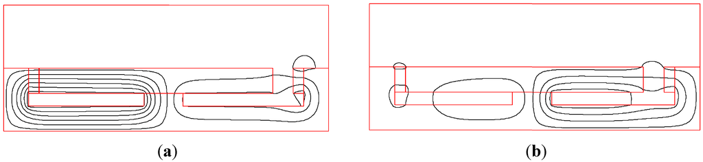 The flux line distribution of the PMBECU without current injected into the coils is shown in Figure 3a. Apparently, the mover is held by the left PM in a steady state without energy consumption. When current with a suitable orientation (i.e., the current direction shown in Figure 2) and value accesses the coils, the mover is polarized, and the corresponding flux lines distribution is shown in Figure 3b. The mover will soon be propelled from the left steady state to the right by the resultant electromagnetic force. Meanwhile, the current is switched off automatically by the position sensor, and the mover is held by the right PM, again without any energy consumption, thus it is bi-stable.