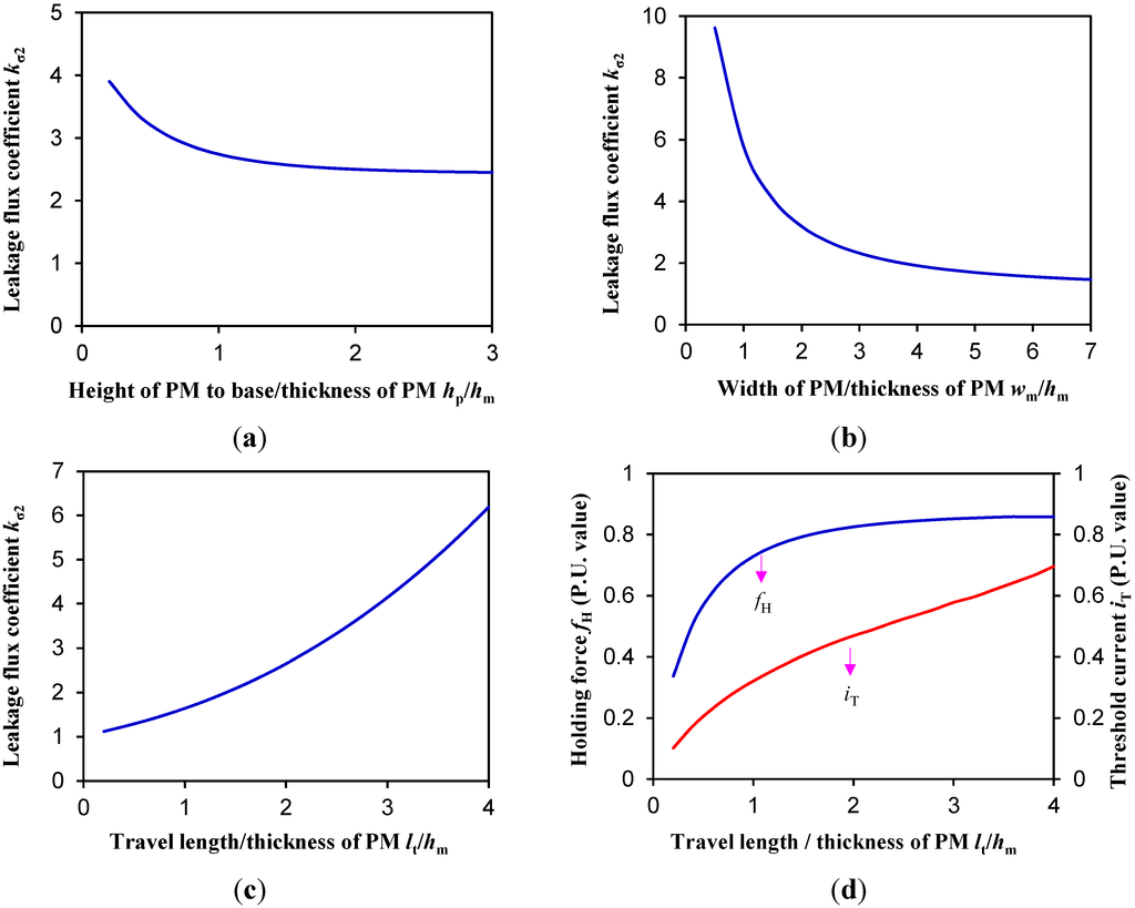 The PMBECU works at steady state most of the time, which is reliably maintained by the holding force, thus the holding force is the most significant index. According to Equation (7), the leakage flux coefficient kσ2 at the detached side, which is a function of the structure parameters, has a great influence on the holding force. Moreover, the leakage flux coefficient determines the reasonable usage of the PM. Thus, the main structure parameters (as labelled in Figure 2), i.e., the width of the PM wm, the height from the PM to the base hp, and the travel length of mover lt, are optimized by studying kσ2, combined with accounting for the holding force and threshold current, where, other size ratios (proportioned to hm) remain unchanged while one varies the parameters within the ranges hp/hm = 1.2, wm/hm = 2.5, lt/hm = 2.