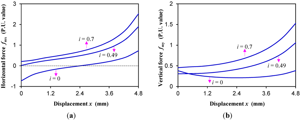 By increasing the current from 0, the electromagnetic force experienced by the mover can be obtained, and then the ideal threshold current iT which critically enables the action of the mover can be obtained by FEM as well, corresponding to the horizontal electromagnetic force fmx = 0. In this paper, current is all normalized to ib = Hchm/N, where N is the number of turns for one coil.