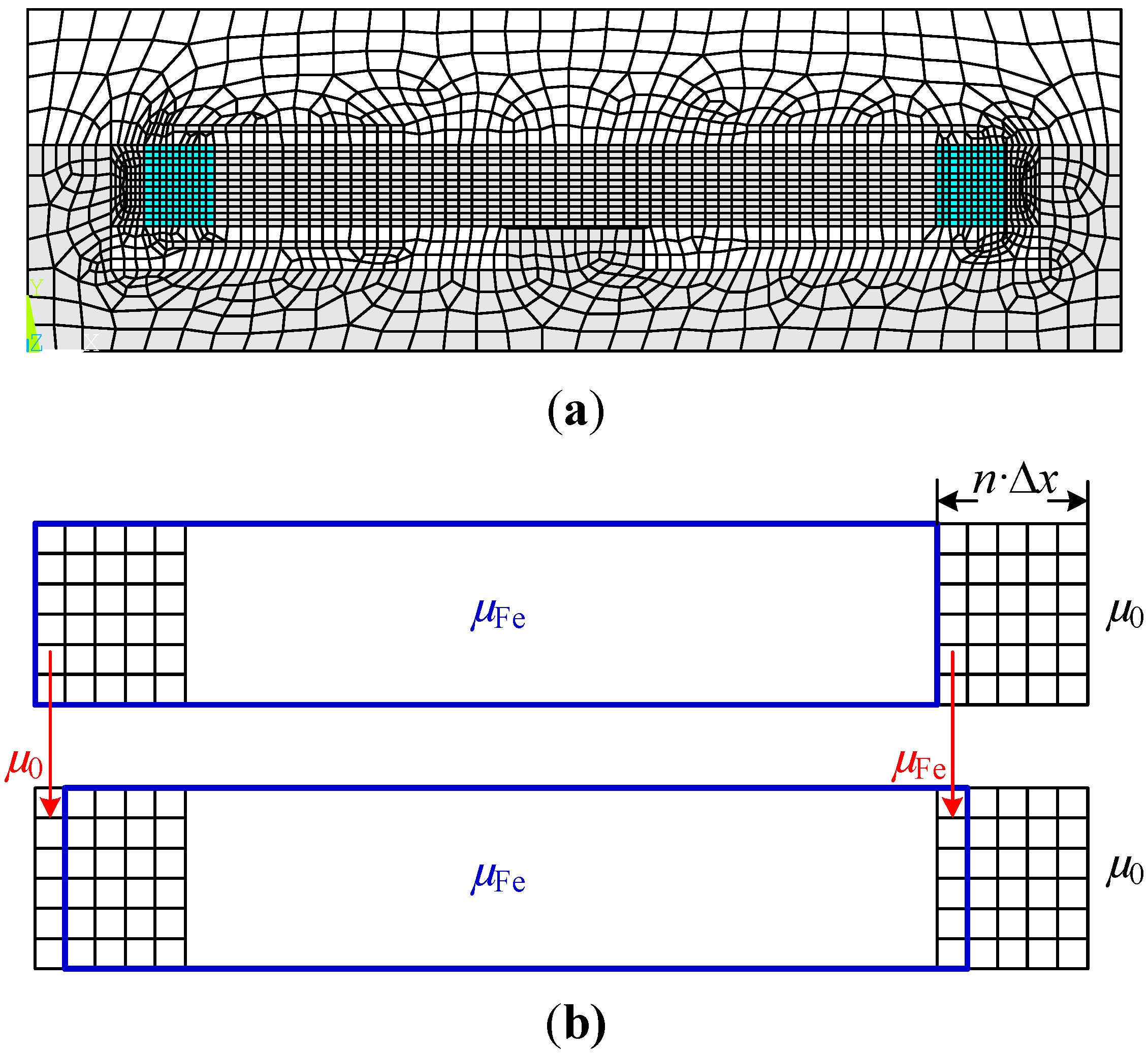 The dynamics analysis of the PMBECU is to illustrate the coupling of the magnetic field and the movement. To cope with the varying friction resistance conditions of the PMBECU, and give consideration to the convenience of analysis of varied structure sizes, an improved FEM is proposed. As shown in Figure 8a, two lt length rectangular areas (namely, the material variation area) in proximity to the PMs are established and uniformly meshed into n steps of quadrilateral shape, i.e., the step length is Δx = lt/n. The initial permeability of the left part and the right are set as iron (μFe) and air (μ0) respectively. As shown in Figure 8b, if the permeability of the first Δx meshes in the left material variation area is changed into μ0 and the first Δx meshes at the right into μFe, a Δx displacement of the mover is equivalently realized. Thus, a onetime mesh can cover the travel length displacement of the mover [23].