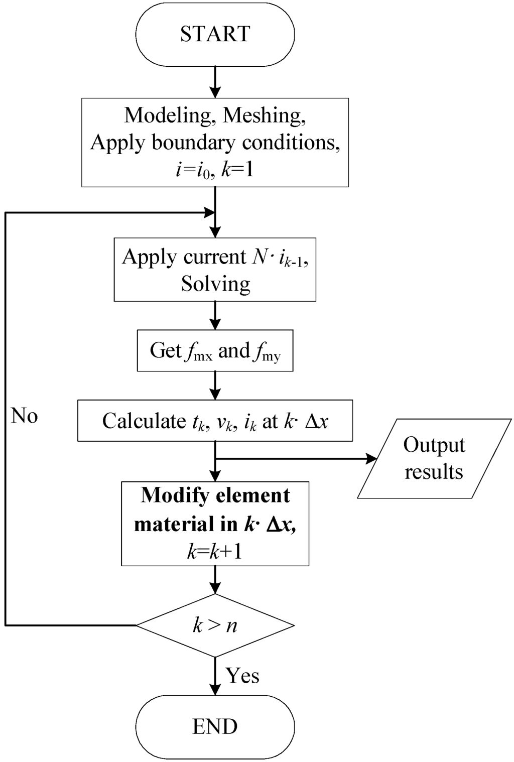 Further, by setting displacement as a known quality but time as an unknown variable, and calculating the time, velocity, and current before each time of material variation, the whole PMBECU movement process (i.e., the dynamics characteristics of the PMBECU) can be solved by using only a onetime mesh. This improved FEM analysis flow chart is shown in Figure 9, where both the current change and resistance variation can be taken into account, which can be easily realized by commercial FEM software (e.g., ANSYS programmable design language). In this paper, at each side of the mover, the front part of the material variation area is finely meshed and the rear part is roughly meshed (because the front part of displacement takes much more time), so as to improve accuracy and reduce the amount of computation.