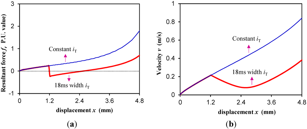With the pulse threshold current accessed (in the calculations, the pulse width is given by the length of the displacement), the dynamics equations can be solved by the improved FEM, then the time pulse width, and finally the force and velocity curves versus displacement and different pulse widths, all can be obtained. The minimum pulse width tw is the pulse width of the threshold current which critically enables the switchover of the PMBECU between engagement and disengagement, i.e., the velocity of mover will be negative if the pulse width is less than tw. The resultant force and velocity curve of the prototype, which vary with displacement and pulse width, are shown in Figure 10.
