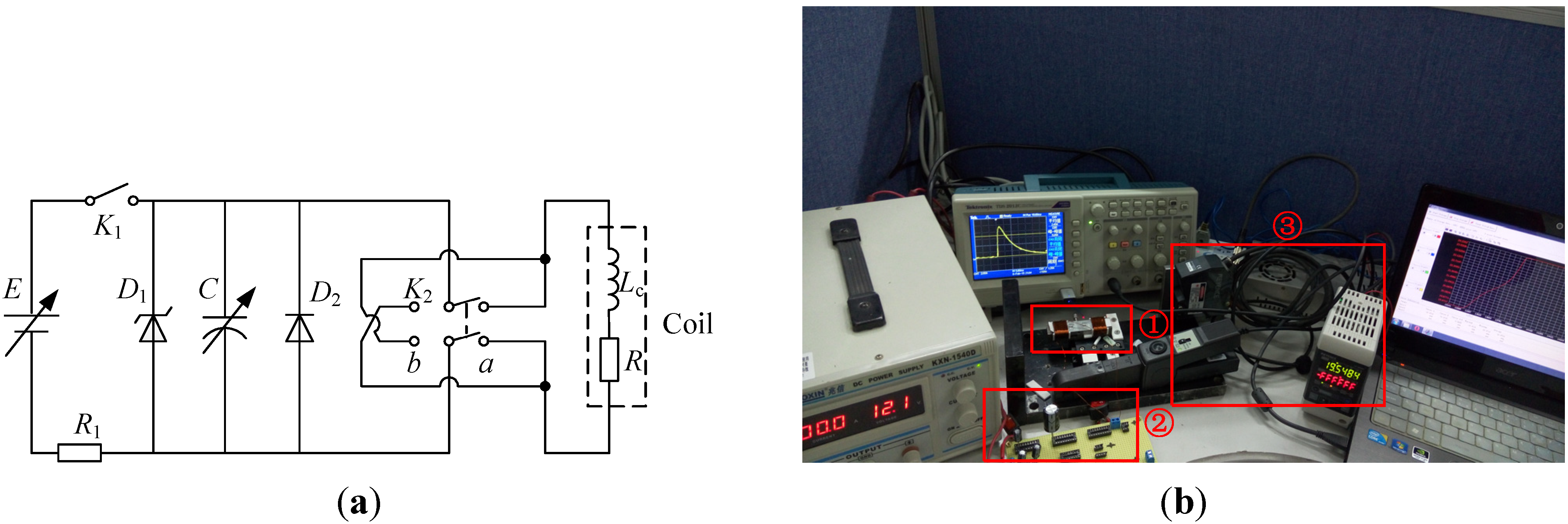 (a) Experimental circuit; (b) Experimental rig, ① Prototype, ② Capacitor supply, ③ Laser displacement transducer.