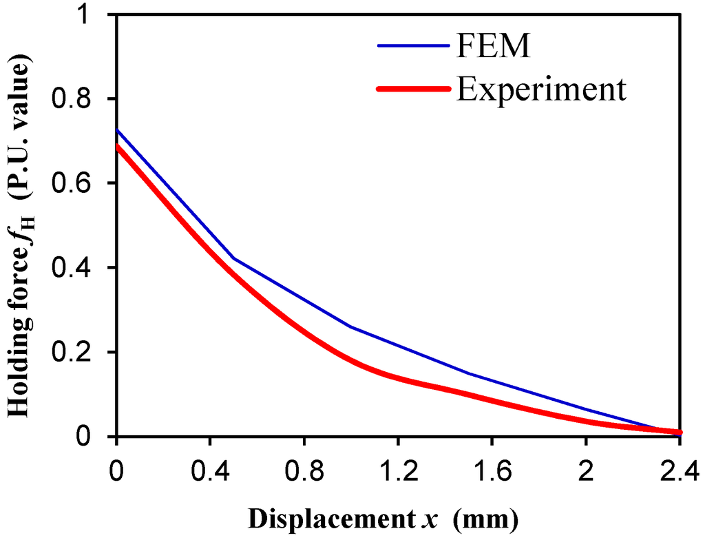 The experimental electric circuit as well as the experimental rig of the PMBECU are shown in Figure 11. First, the holding force at different positions was measured and compared to the FEM calculation results (there is an initial air gap δ1 = 0.1 mm and a contact air gap in the mid part of δ0 = 0.18 mm which had been accounted in the FEM model) as shown in Figure 12. The experimental results are a little smaller than the simulation results which is mainly attributed to the round corners of the PM, but it still shows an acceptable engineering accuracy.