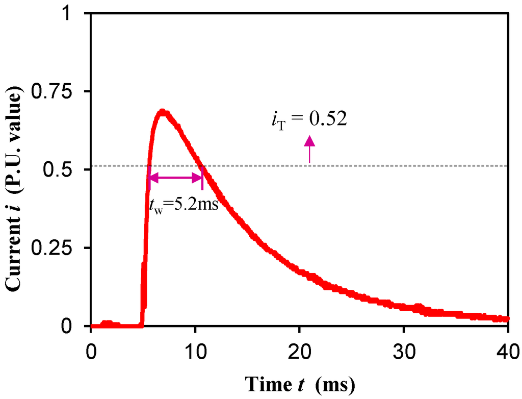 The pulse current applied to coil is approximately generated by a capacitor discharge lower power pulse supply. By changing the capacitance (i.e., changing pulse width), and tuning the charging voltage (keeping iM = 0.7), the practicable minimum pulse width can be obtained, which is tw = 5.2 ms in this prototype, and the corresponding discharge current curve is shown in Figure 13. Because the maximum discharge current is larger than the threshold current, and the continuous discharging current curve is superior to the rectangular pulse current, the minimum pulse width of the low power capacitor supply is much smaller.