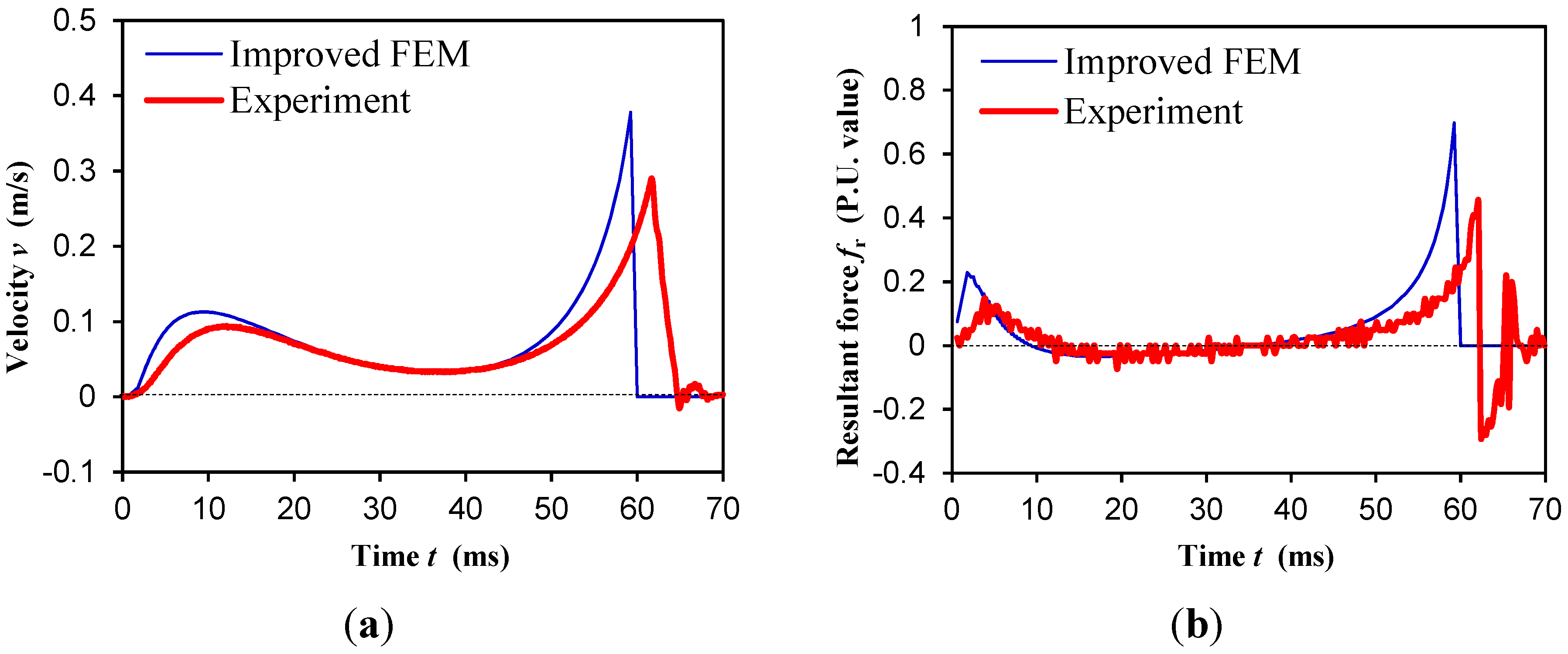 The comparison between the improved FEM simulation and the experimental dynamics characteristics results are displayed in Figure 14, which shows a satisfactory agreement aside from the slight bounce of the mover, where the experimental velocity and dynamics force of the mover are derived from the differential and second order differential of the measured displacement curve. Thus, the improved FEM is an effective method for dynamics analysis of the PMBECU. What’s more, compared to the dynamics characteristics under constant current, the force on the mover is evener, the velocity of the mover is steadier, and the control is much simpler (the current decays automatically without switching off by position detection), and thus represents the optimal power supply scheme for the PMBECU.