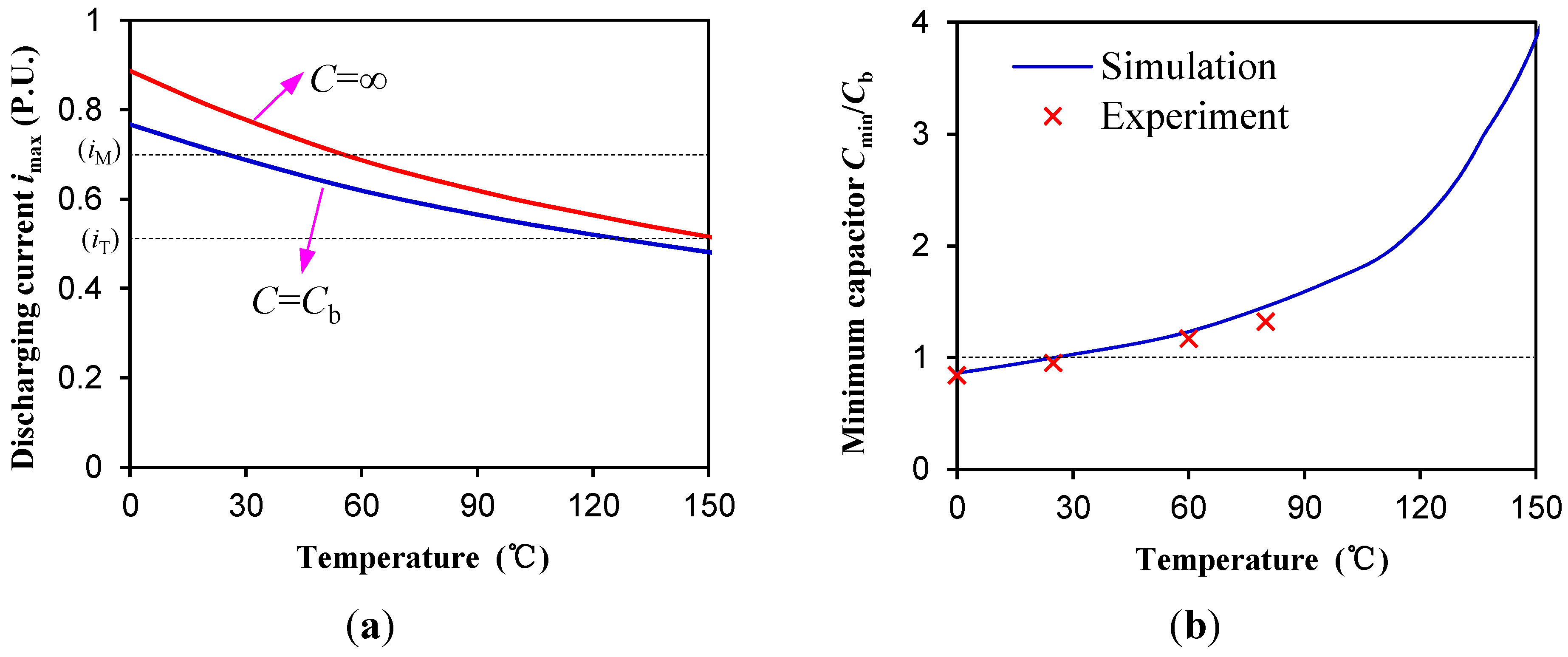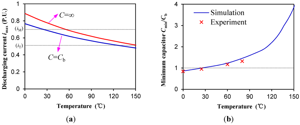 Electromagnetic characteristics variation with temperature. (a) Maximum discharge current; (b) Minimum capacitor enables the work of the PMBECU.