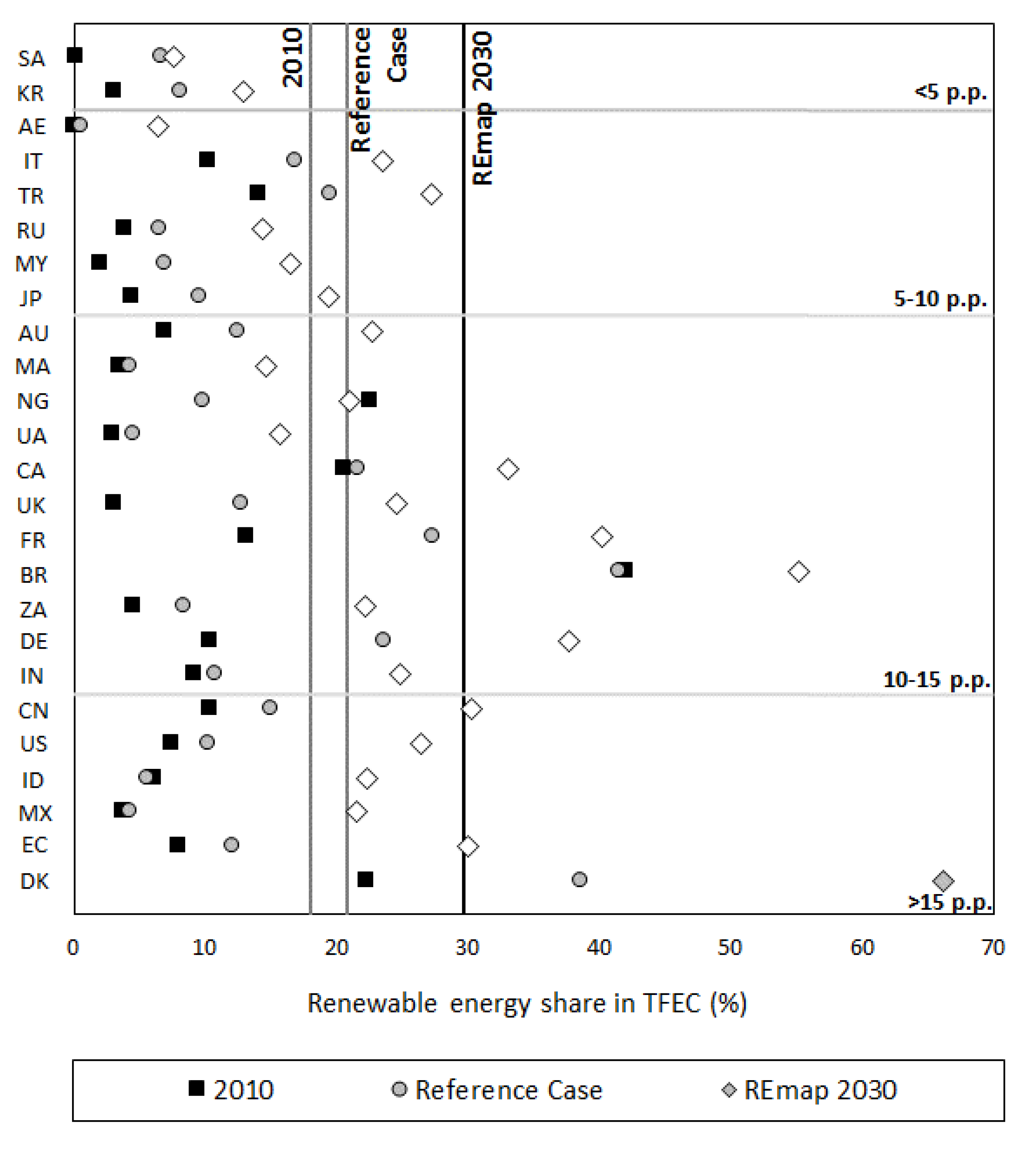 | Country | 2010 | Reference Case | REmap 2030 | Contribution to global RE use 2030 | RE share in REmap 2030 |