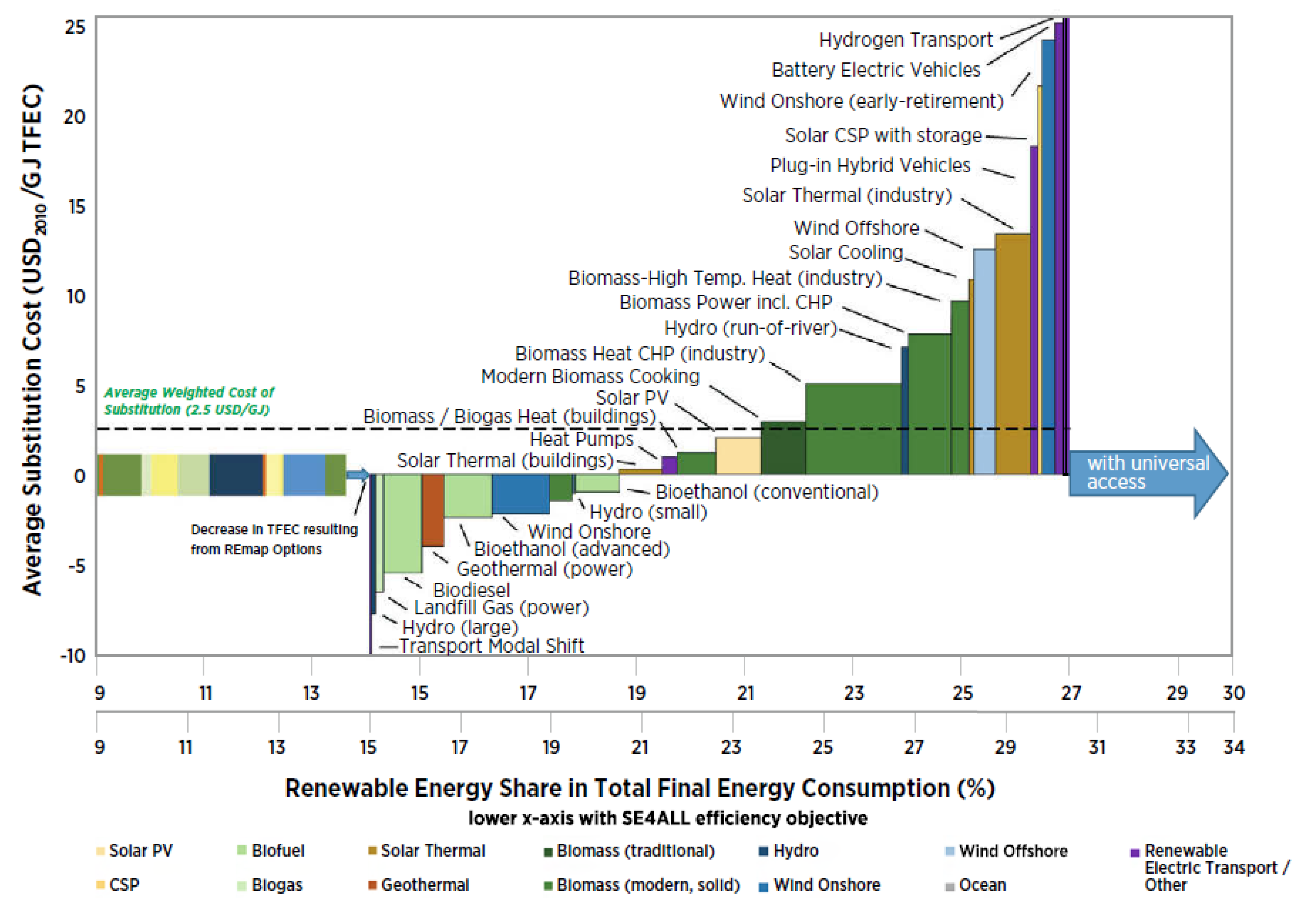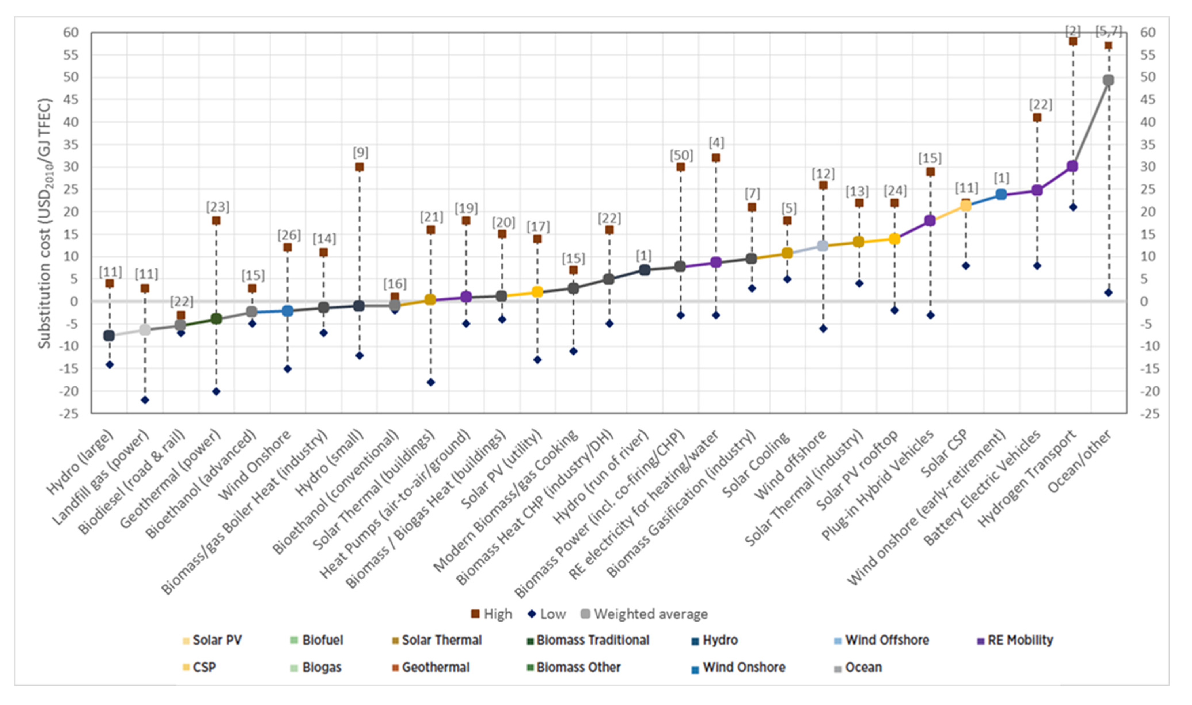 - Substitution cost (in USD/GJ) (indicator 3): This is the key indicator to estimate the cost-effectiveness of renewable energy technologies. It represents the difference between the annualized costs of the REmap Options and a conventional technology used to generate the same amount of useful energy output (e.g., cooking heat, electricity, mechanical work) divided by the total renewable energy use in final energy terms. Negative substitution costs suggest that there are opportunities to save money, whilst positive substitution costs suggest that additional efforts will be needed to attract the investments required to achieve the targeted deployment levels. This indicator represents the challenges associated with the need to attract innovation investments. A thorough consultation with experts complements the estimates of substitution costs and reduces the uncertainty in the estimates. By doing so, substitution costs can guide both investors and policy-makers on innovation investment opportunities arising in certain technology and sectors, as well as the efforts required to expand the funding portfolio within certain other innovative technological fields.