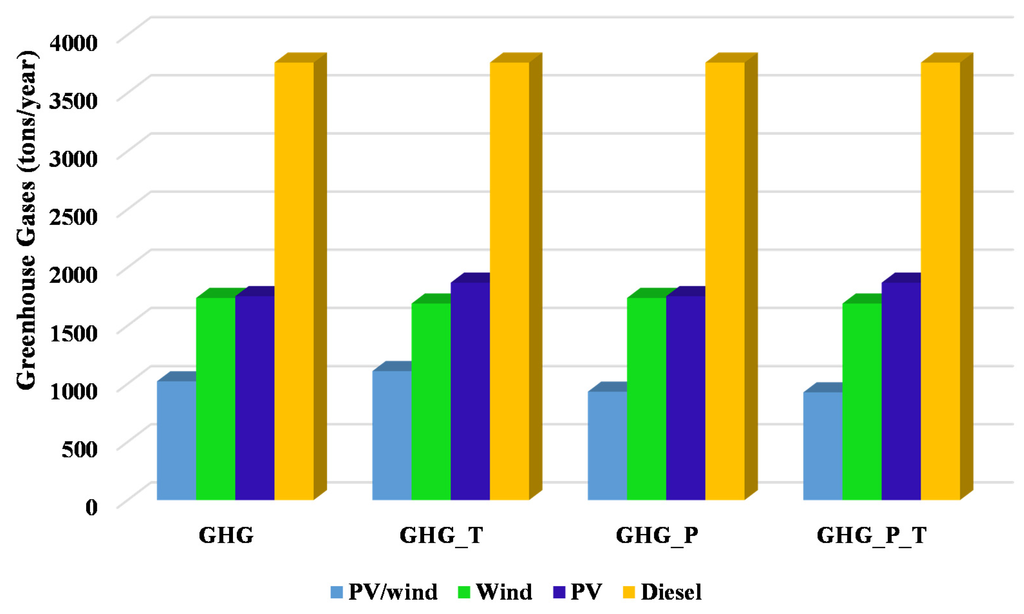 The different amounts of greenhouse gases (GHG) emitted by PV/wind/diesel/battery, wind/diesel/battery, PV/diesel/battery and diesel/battery systems in Alexandria, Egypt.