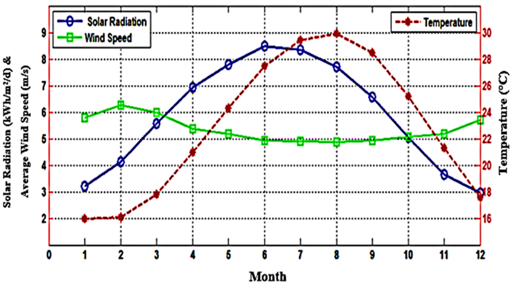 Figure 4 shows the average monthly solar radiation, wind speed and earth’s surface temperature data in Alexandria, Egypt. The 22-year average monthly solar radiation data, the 10-year average monthly wind speed data and the 22-year average monthly of the earth’s surface temperature of Alexandria, which is located at (31.2 N, 29.92 E); were obtained from NASA (National Aeronautics and Space Administration) database [41]. According to NASA data, the annual average solar radiation is 5.87 kWh/m2/day, the annual average wind speed is 5.34 m/s and the annual average earth’s surface temperature is 22.9 °C.