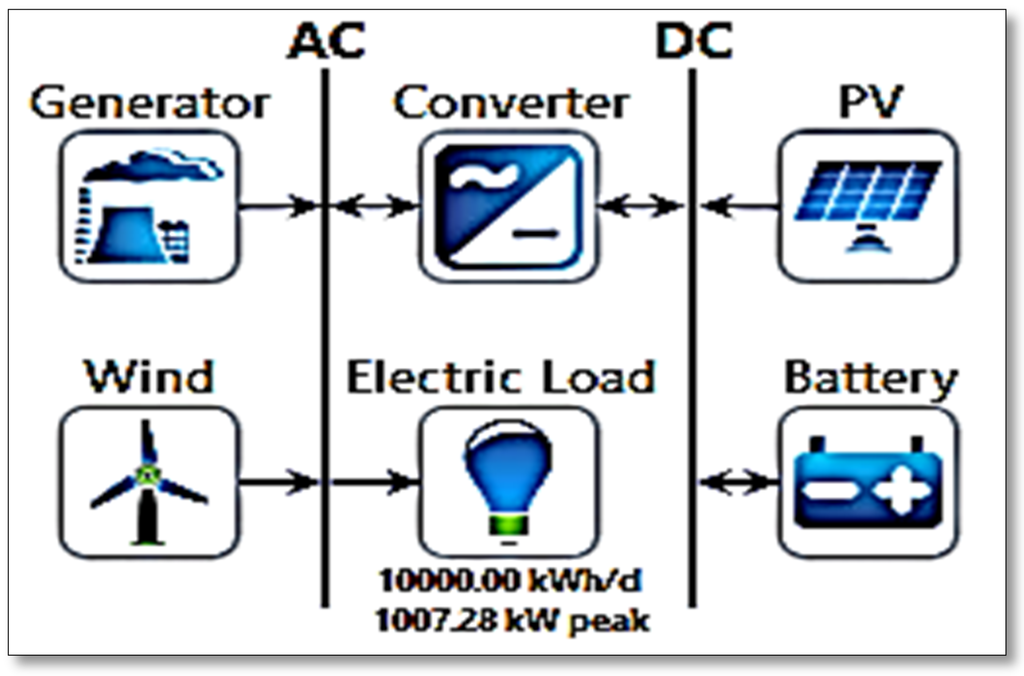 According to Figure 4, we can note that the peak value of the average monthly solar radiation in summer season in contrast of the average monthly wind speed. Furthermore, it is an indicator that the optimum hybrid configuration system is the system, which combines PV with wind to make the best use of their operating characteristics and to obtain efficiencies higher than, which could have been obtained from a single power source. This feature results from the ability of HRES to take advantage of the complementary diurnal (night/day) and seasonal characteristics of the available renewable energy resources at a given site [42,43]. Figure 5 shows the optimum configuration model of hybrid PV/wind/diesel/battery system of the proposed tourist village in the study based on the user inputs of the load, components costs, components technical details, solar and wind resources availability.