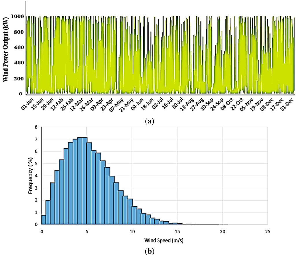 Figure 7. (a) The yearly wind turbine power output of the HRES for the proposed tourist village in the study; (b) Weibull probability distribution function of wind speed histogram. - 3