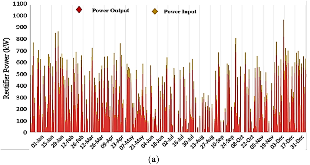Figure 9. (a) The yearly rectifier power input and power output; (b) the yearly inverter power input and power output. - 5