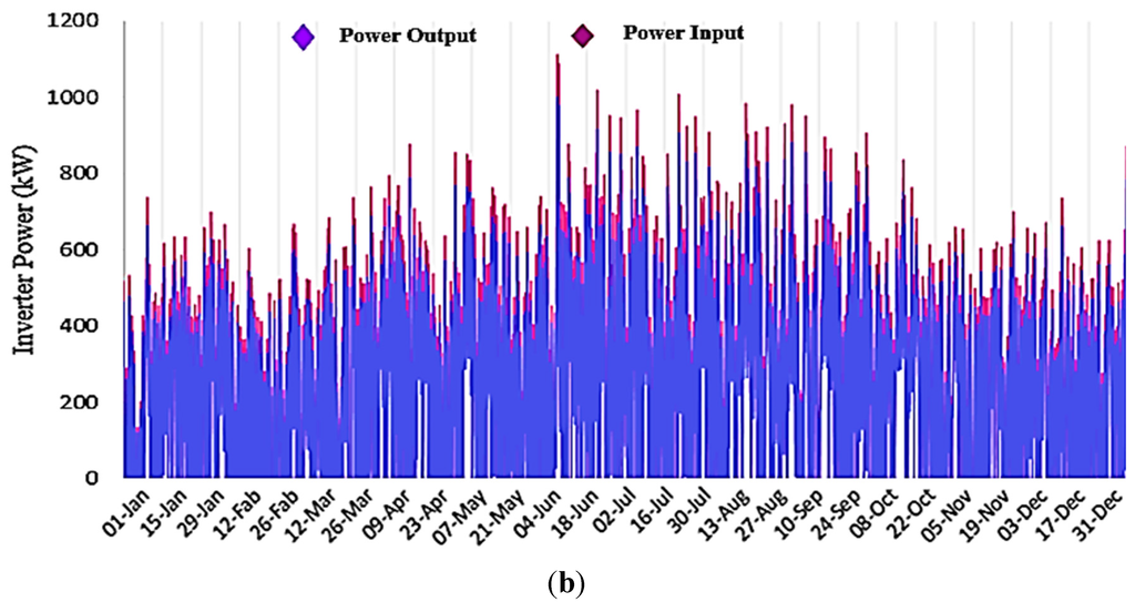 - Power converters (1000 kW), Figure 9a,b show the yearly rectifier and inverter power input and power output of the HRES for the proposed tourist village in the study. It should be noted that the converter has two functions; first rectifier to convert AC power to DC power (batteries charger), second inverter to convert DC power to AC power (energy flow from the PV or the batteries to the AC load). The energy output from the rectifier is 229,757 kWh/year while the energy input to the rectifier is 270,303 kWh/year with losses of 40,546 kWh/year. The time of operation of the power converter as a rectifier during the year is 1433 h. The energy output from the inverter is 2,045,117 kWh/year while the energy input to the inverter is 2,272,351 kWh/year with losses of 227,234 kWh/year. The time of operation of the power converter as an inverter during the year is 6295 h.