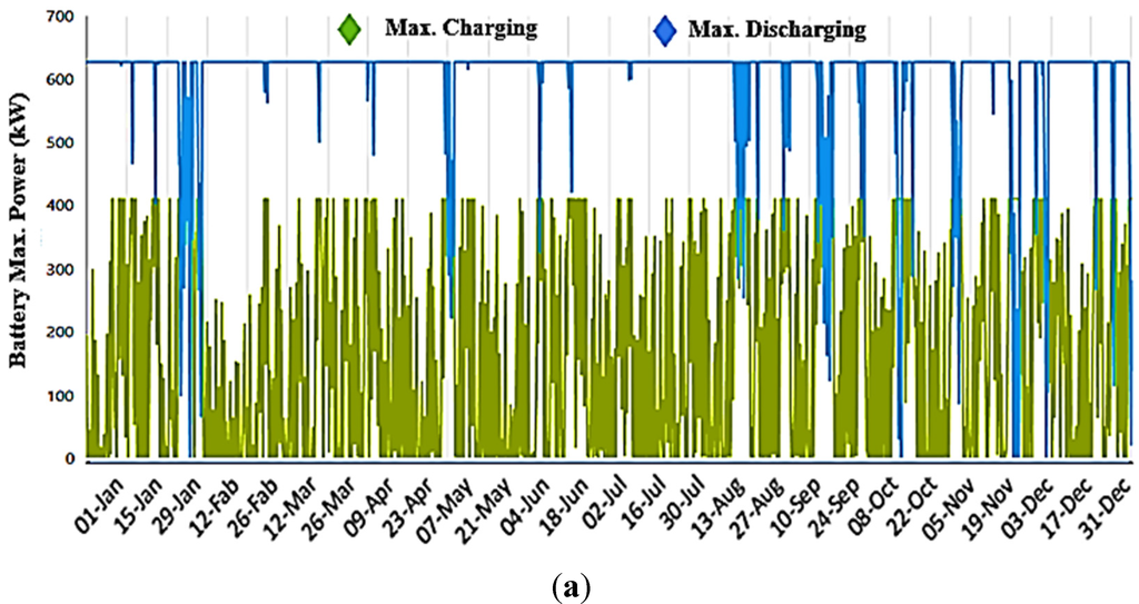 (a) The yearly battery maximum charging and maximum discharging power; (b) The yearly battery charging and discharging power; (c) The yearly batteries input power and batteries state of charge.