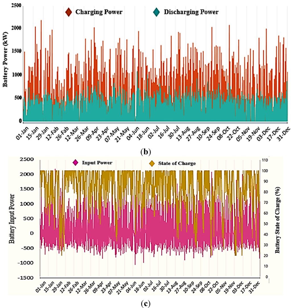 - Batteries (2000 batteries, with the capacity of 589 Ah each), Figure 10a,b show the yearly battery charging and discharging power and maximum power. Figure 10c shows the yearly batteries input power and batteries state of charge. The batteries state of charge is around 100% most of the year. The energy output from the batteries is 1,346,038 kWh/year while the energy input to the batteries is 1,569,687 kWh/year with losses of 214,431 kWh/year and storage depletion of 9218 kWh/year. Additionally, the expected lifetime of the batteries is 17.26 years.