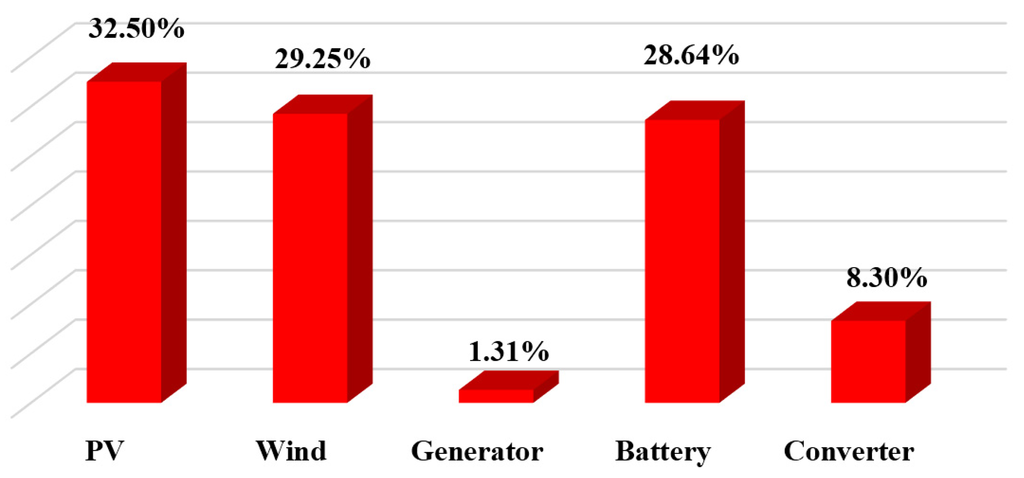 Figure 11 shows the cost of each component of the optimum hybrid PV/wind/diesel/battery system as a percentage. The cost of PV system, wind turbines, diesel generator, batteries and power converters during the 25 years of the project’s lifetime, using 8% annual interest rate are $5,000,000, $4,500,000, $202,851, $4,405,509 and $1,275,000 respectively. Moreover, the PV system has the maximum cost in the optimum hybrid PV/wind/diesel/battery system followed by wind turbines, batteries and power converters. On the other hand, the diesel generator has the minimum component cost in the optimum hybrid PV/wind/diesel/battery system as it is time of operation is only 225 h in five starts during the year as shown in Figure 8.