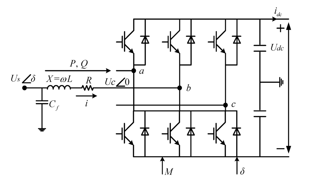 The main circuit topology of converter for VSC-HVDC is composed of a conventional two-level six-bridges pulse width modulation (PWM) voltage source converter [,], which is shown in the Figure 2. In Figure 2, refers to fundamental component of AC bus voltage, is the fundamental component of converter’s output voltage, is the angle that lags to parameter R and X are the inductance and resistance of phase reactor of the VSC respectively, and capacitor represents the shunt filter.