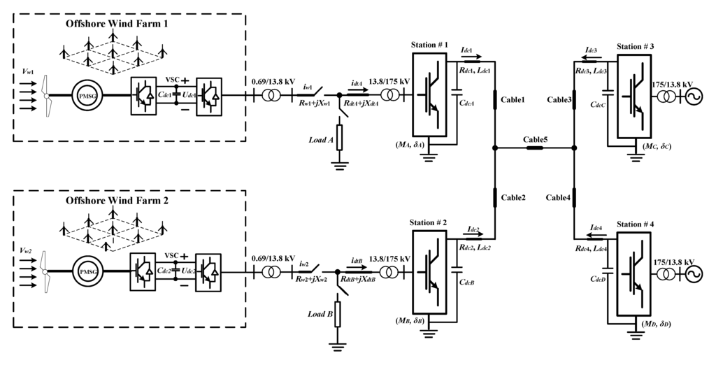 In this paper, a four-terminal HVDC system will be considered two large-scale offshore wind farms are integrated into this four-terminal HVDC system. As is shown in Figure 3, each offshore wind farm contains its local AC network to connect individual wind farms, and each feeder is to convert the AC into DC fed to the HVDC network.