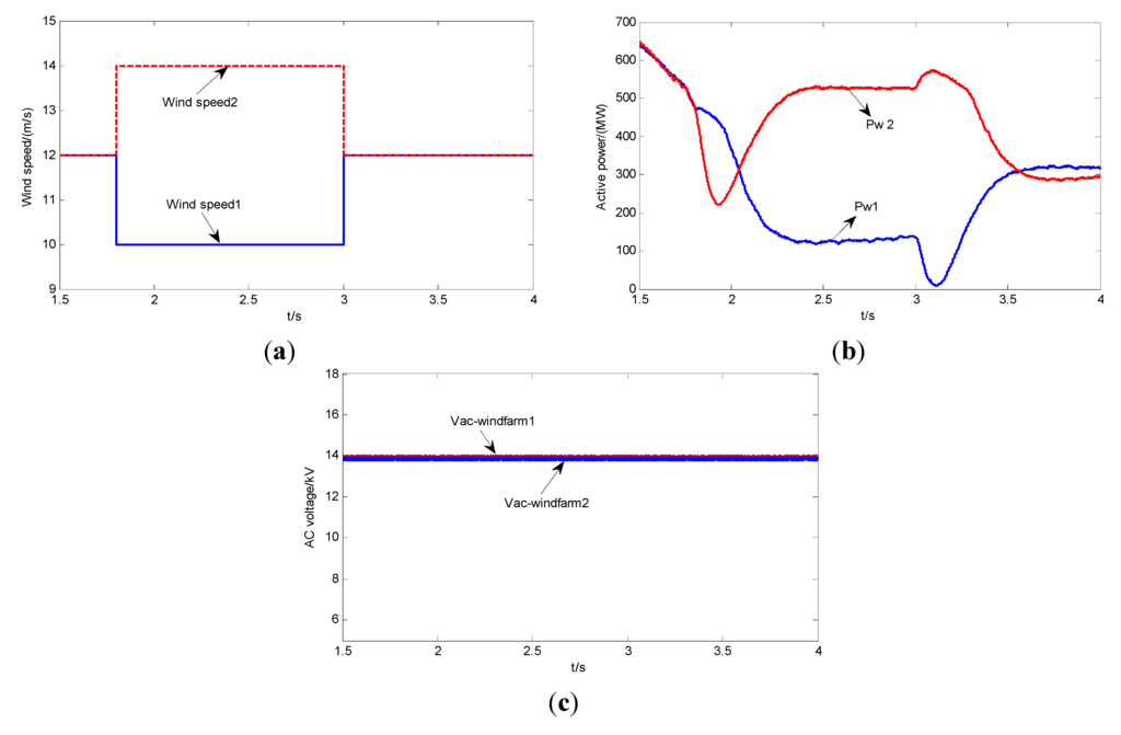 The performance of a VSC station integrated with wind farms is investigated in the case of variable wind speed, and the simulation results are shown in Figure 10. The gust wind speed of wind farm 1 and 2 are introduced at 1.8 s and 3.0 s with the fluctuation, slowing down from 12 to 10 m/s and ramping up from 10 to 12 m/s for wind farm 1, ramping up from 12 to 14 m/s and slowing down from 14 to 12 m/s for wind farm 2 in Figure 10a. To collect the stochastic wind power, the ac side needs to supply constant ac voltage for the wind farm network and absorb fluctuant power automatically.