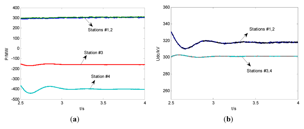 The capacity ratio of P3ref/P4ref is inverse proportion to optimal ratio value of the resistance of DC line 3 and 4, and improved adaptive droop control is used for VSC-MTDC without local load and the dynamic responses of four-terminal HVDC are shown in Figure 11. It can be seen from Figure 11a,b that converter station can follow the power reference value quickly, among which stations #1 and #2 export about 300 MW. In addition, due to the obvious DC voltage loss caused by large resistance of DC line, voltage of rectifier side (stations #1 and #2) is about 306 kV and voltage of inverter side (stations #3 and #4) is about 300 kV that is hold by the introduced common DC voltage Udc_slack. If DC line resistance of VSC-MTDC system increases, the voltage loss would be greater.