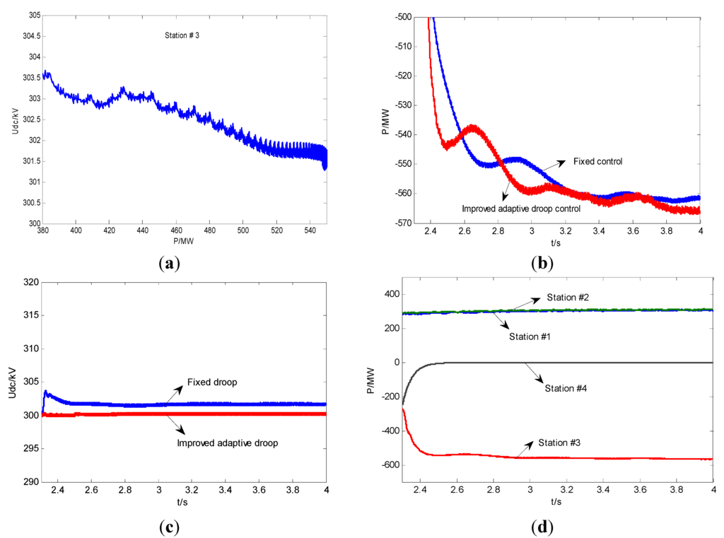 The dynamic response of four-terminal HVDC system following inverter outage is shown in Figure 12. Figure 12a shows that in absence of station #4, slack converter station #3 operating in voltage-power droop control mode increases its power to compensate the power imbalance of the inverter. From Figure 12b, the power sharing of station #3 by improved adaptive droop is larger than that of fixed droop. The reduction of the copper loss is because improved droop control ensures a higher droop value than fixed droop. Variation of DC voltage at converter station #3 is shown in Figure 12c, which is larger than common bus voltage 300 kV with very little overshoot in its transient response for fixed droop control. Therefore, the improved adaptive droop scheme can steady the DC voltage dynamics. In addition, Figure 12d indicates that control strategy of station #3 and #4 can follow the dynamic response effectively. Then HVDC system could reach the post-outage steady-state operating point at 2.4 s. The results in this case are related to system parameters, such as the line resistances. Because the copper loss of HVDC system is square to the line resistances, if line resistances of VSC-HVDC system are much larger, much copper loss would be reduced, and then simulations will be more evident.