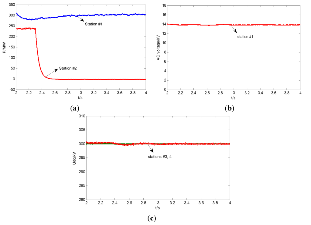 The outage of station #2 appears at 2.3 s, and dynamic response of VSC-MTDC system with fixed droop and improved adaptive droop following the contingency are shown in Figure 13. It is to be noted from Figure 13a that control strategy of station #1 and #2 can follow the power dynamics. In addition, it can be seen from Figure 13b,c that the AC voltage of station #1 can stable operate at 13.8 kV, and it has no effect on DC voltage of VSC inverter side (station #3 and 4) under condition following station #2 outage.
