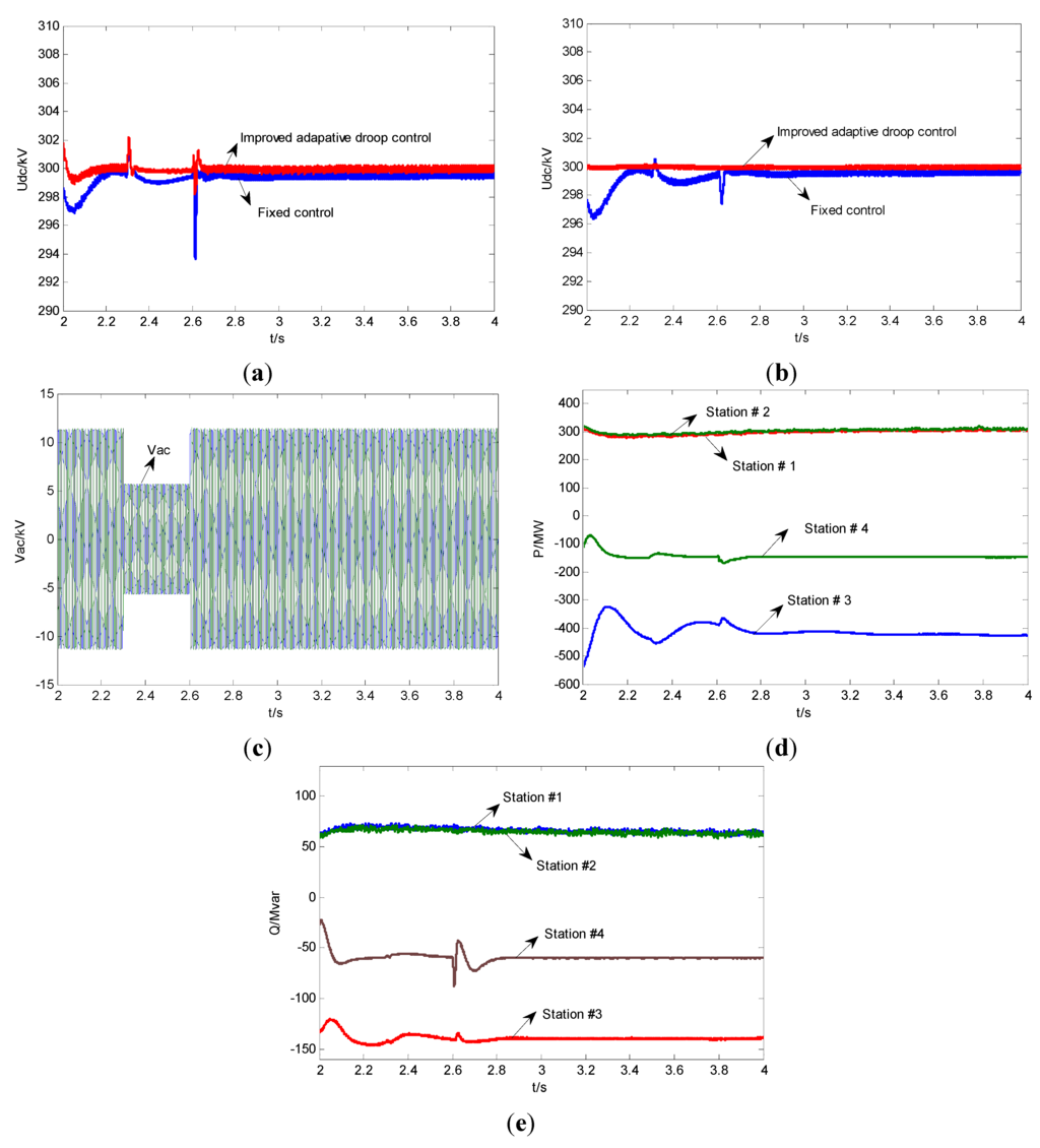 In this section, the performance of the fixed droop and improved adaptive droop control is compared. If a short-circuit fault is detected in AC side close to points of common coupling (PCC), the PCC voltage will be reduced, which in turn affects voltages and currents of ac transmission grid close to PCC. To prevent destructive overcurrent, then distance protection would be actuated at this time. In this case, a three-phase short-circuit fault is introduced at 2.3 s on station #4 with a duration of 300 ms. If the short-circuit fault is detected, the AC side voltage of station #4 decreased from 13.8 kV to 7.0 kV. Dynamic responses of MTDC grid with fixed droop following the contingency are shown in Figure 14. During the disturbance, as shown in Figure 14a,b, DC voltage of station #4 decreased to 298 kV from 300 kV as using the improved droop control while the ones decreased to 293 kV from 300 kV as using fixed droop control method. Therefore, overshoot amount of improved droop control is less than the ones of fixed droop control. Since AC voltage of wind farm was controlled at constant value, its power output about 600 MW injected into VSC-MTDC network remained unchanged. In addition, improved droop control can hold DC voltage of station #3 at 300 kV while fixed droop control cannot realize this objective. The reason is that common DC voltage and available headroom of converter are considered as designing the control strategy of HVDC grid, and the proposed method could improve the stable operation of converter. From Figure 14d,e, it can be seen that the control strategy of station #3 and #4 can follow the active/reactive power dynamic response, and there is small variation for power when improved droop control is employed.