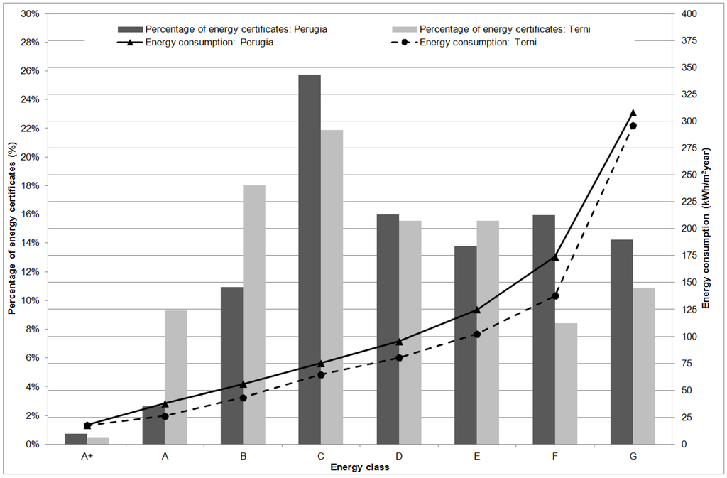 A more detailed analysis shows that it is possible to evaluate the mean energy consumption of buildings (on the right y-axis of Figure 2) and the percentage of the number of certificates (on the left y-axis of Figure 2) as a function of the energy class. The main part of the buildings are in the C and D energy class, with a mean energy consumption of about 85 kWh/(m2year) for Perugia and 72 kWh/(m2year) for Terni. The remaining part of the buildings presents a very high energy consumption, especially the ones in class F (with a mean energy consumption of about 173 kWh/(m2year) for Perugia and 137 kWh/(m2year) for Terni) and in class G (about 300 kWh/(m2year) for both cities).