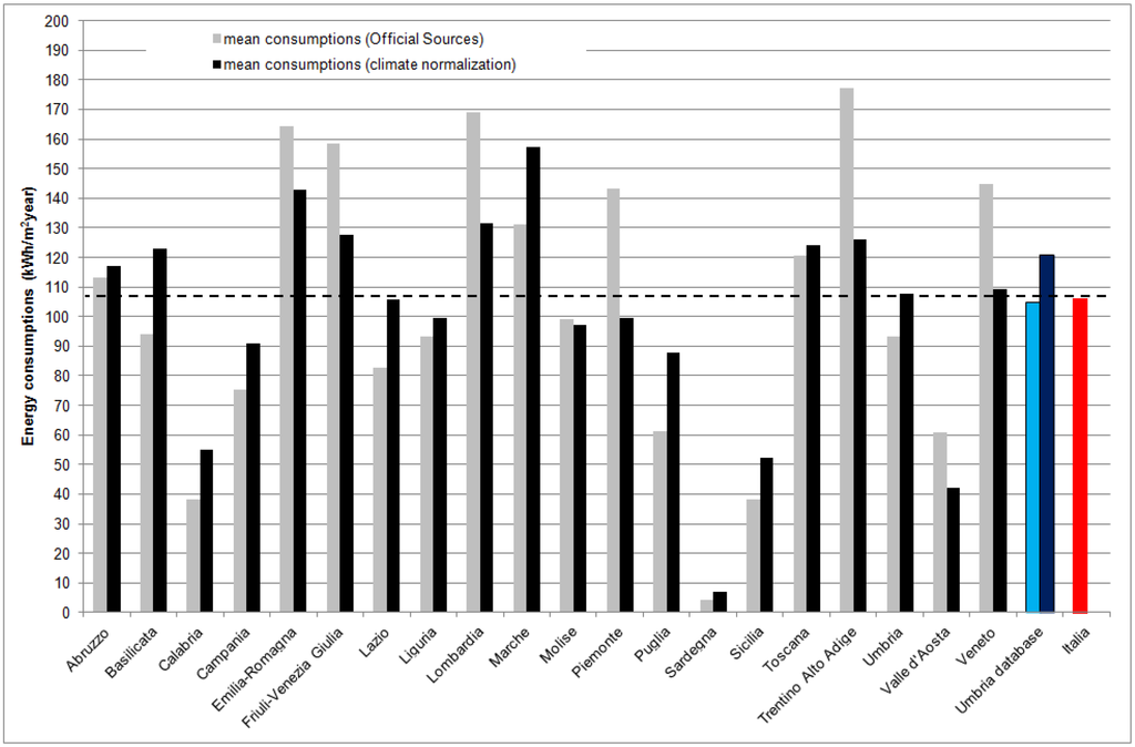 In order to compare the mean energy performance of the buildings in Umbria with the Italian and European ones, a climate normalization was carried out.