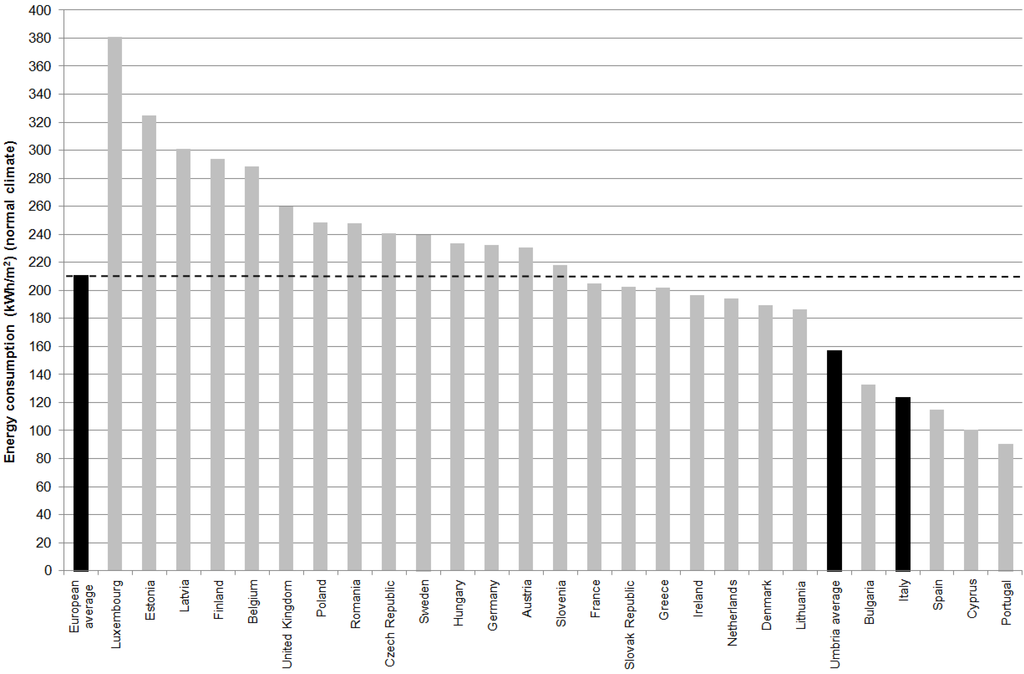 Comparison of the energy performance of Umbrian buildings with the one of European countries and with the mean value for European buildings.