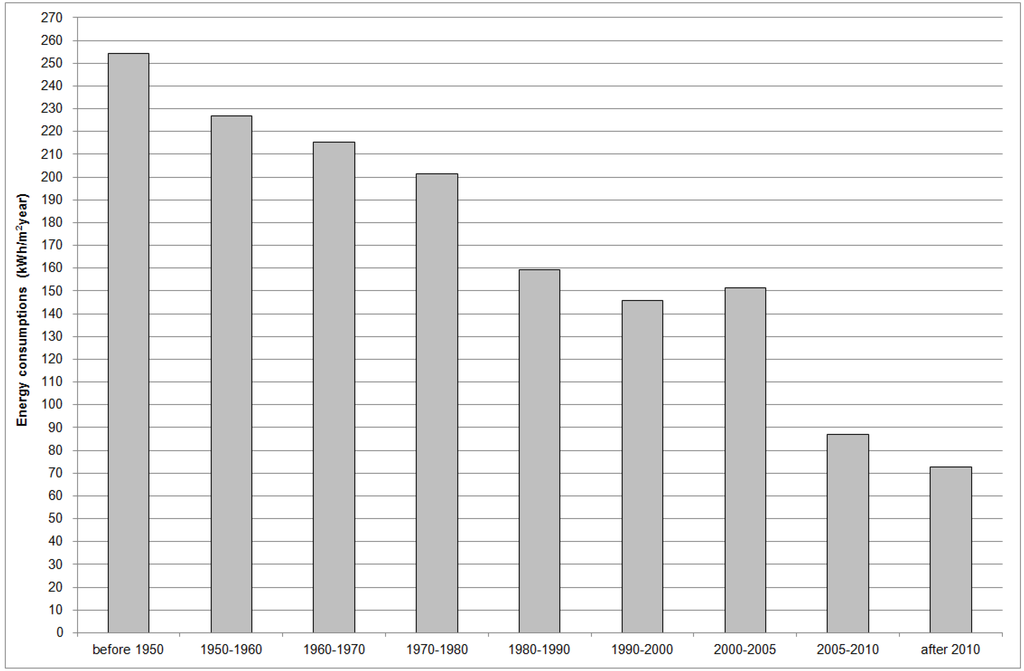 Energy consumption of Umbrian buildings as a function the of year of construction.